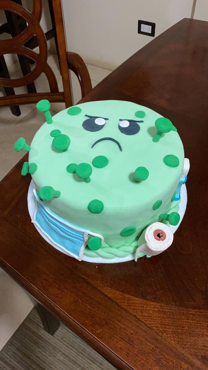 Si bien fue Amanda la que pidió que fuera en forma de coronavirus, don Leo le puso su sello creativo y buscó imágenes en Internet de cómo es este virus y añadió su toque personal, con algunos otros elementos en torno al tema, como una mascarilla, un alcohol en gel y un rollo de papel higiénico.
