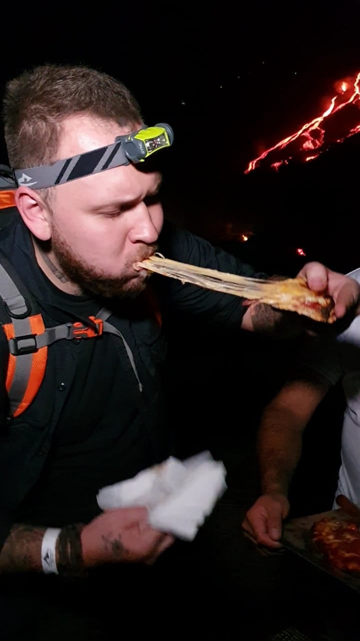 “Cociné a las brazas volcánicas un churrasco y una pizza básica con salsa de tomate, queso mozarella, salami, jamón, chile dulce, cebolla. No lo pusimos directamente sobre la lava porque el metal no hubiera soportado, pero sí sobre lava calcificada que estaba conteniendo lava líquida, era superinsoportable el calor, pero se logró cocinar”, contó.