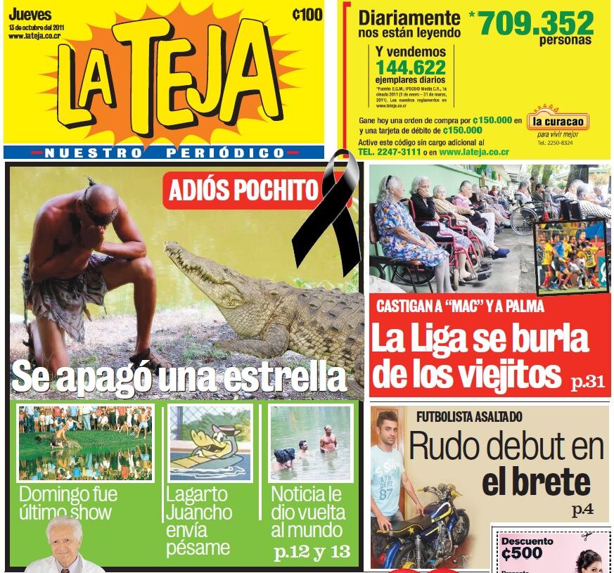 Ellos pasaron juntos 22 años inolvidables en la laguna del centro turístico Las Tilapias, en Siquirres, donde todos los domingos llegaba un tanate de gente a disfrutar del show en el que Chito metía la cabeza en el hocico de su querido Pocho.