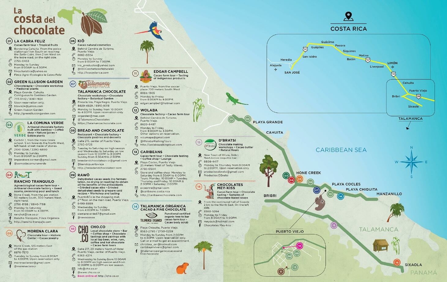 Los productores de cacao de Talamanca, en la provincia de Limón, crearon el primer mapa con la ruta del chocolate, una forma de promocionar sus dulces creaciones y poner el ojo del turismo mundial en ese hermoso paraíso natural.