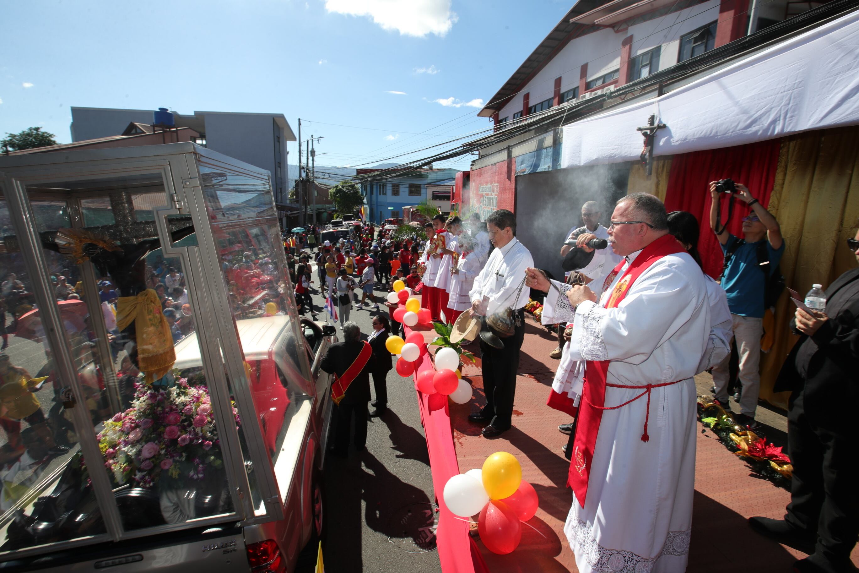 El padre Sergio, también presidente de la Asociación Obras del Espíritu Santo, bendijo a los fieles, repartió juguitos, galletas, sorbetos y hasta popis. Por cierto, todo lo que repartió fue una gran salvada, ya que el sol estaba picando duro y urgía refrescarse. También, el padre bendijo con incienso el paso de la imagen peregrina del Negrito.