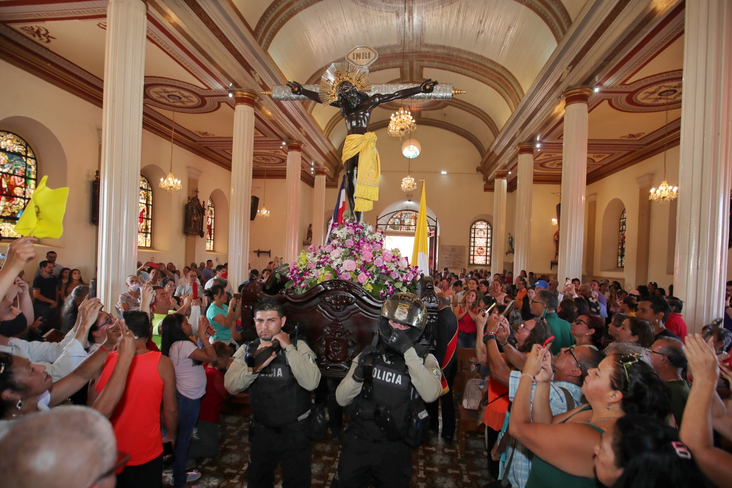 La Guardia de Honor de Adultos y del Movimiento Juvenil de Alajuelita le entregaron, por así decirlo, la imagen a oficiales de la Fuerza Pública, quienes se encargaron de cargarla y llevarla hasta casi el altar del Santuario, no sin antes ser bendecida por monseñor Quirós, quien de inmediato presidió la misa que se celebró.