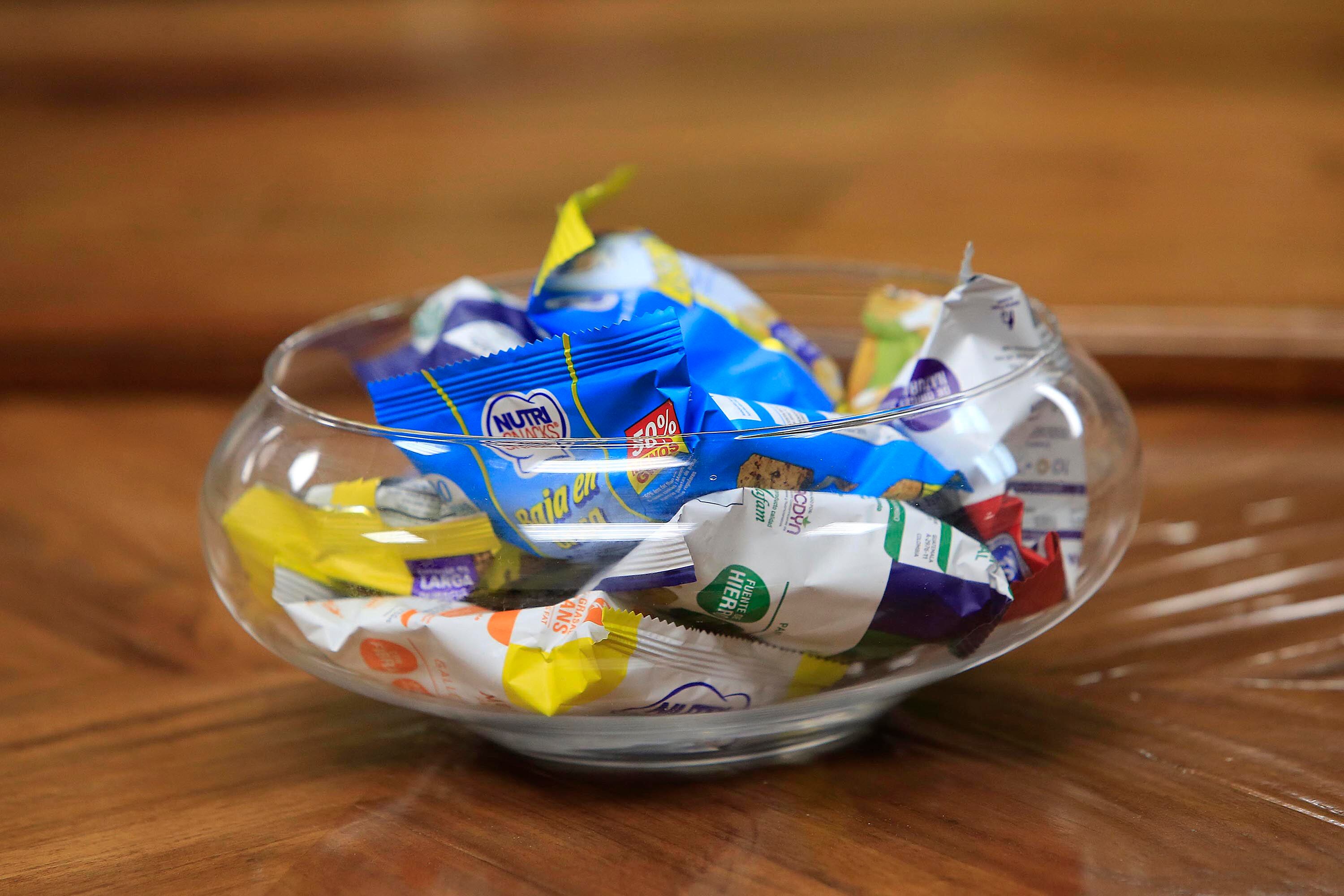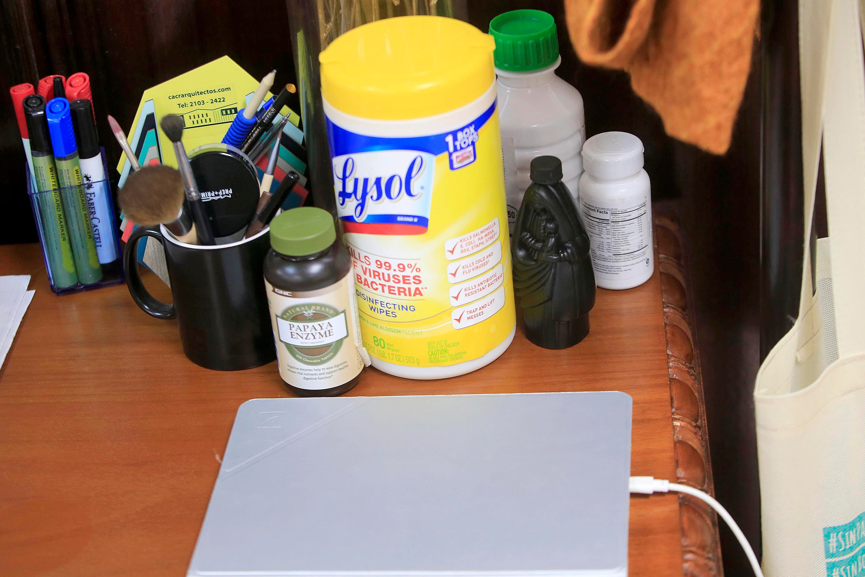 Las antiguas sillitas para el té pasaron a la historia. Para ella un iPad y una mesita donde coloca su bolso y otras cositas personales es más que suficiente. Ahí pudimos ver una imagencita de la Virgen de los Ángeles llena de agua bendita y una botellita de encimas de papaya que ayudan a la digestión.