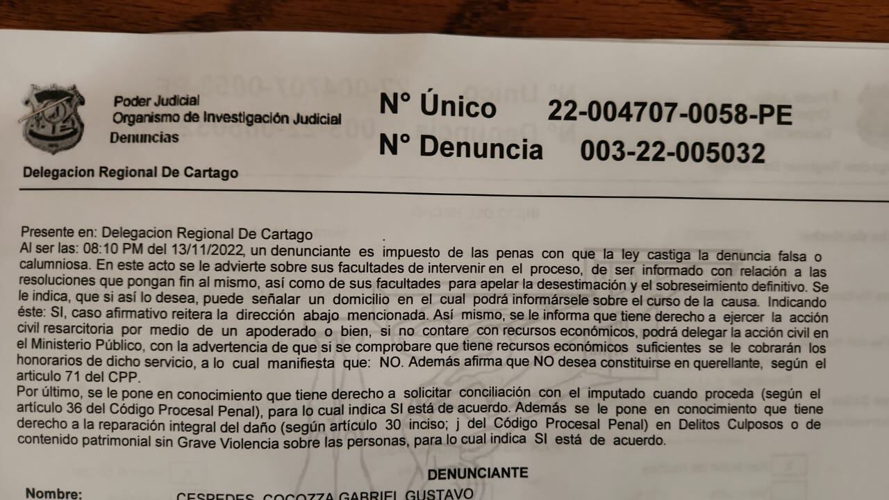 Céspedes interpuso la denuncia ante el Organismo de Investigación Judicial (OIJ) este domingo en la oficina de Cartago, pero la trasladaron a Tres Ríos, que es donde él reside y desde donde hizo los pagos.
