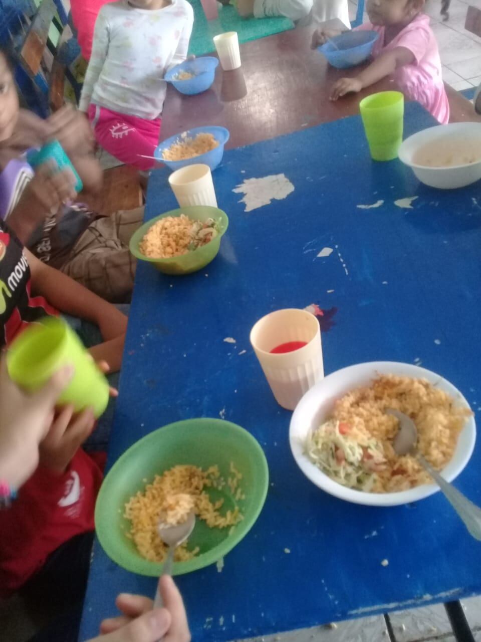 Nos explica doña Flor que a algunos niños, que viven situaciones económicas muy duras en sus casas, les dan un gallito para que lleven, porque como ellos abren de 7:45 a.m. a 1 de la tarde, saben que los peques se van almorzaditos, pero queda toda la tarde y la noche. Ella se queda orando por sus niños porque después de ahí no tienen más que comer.