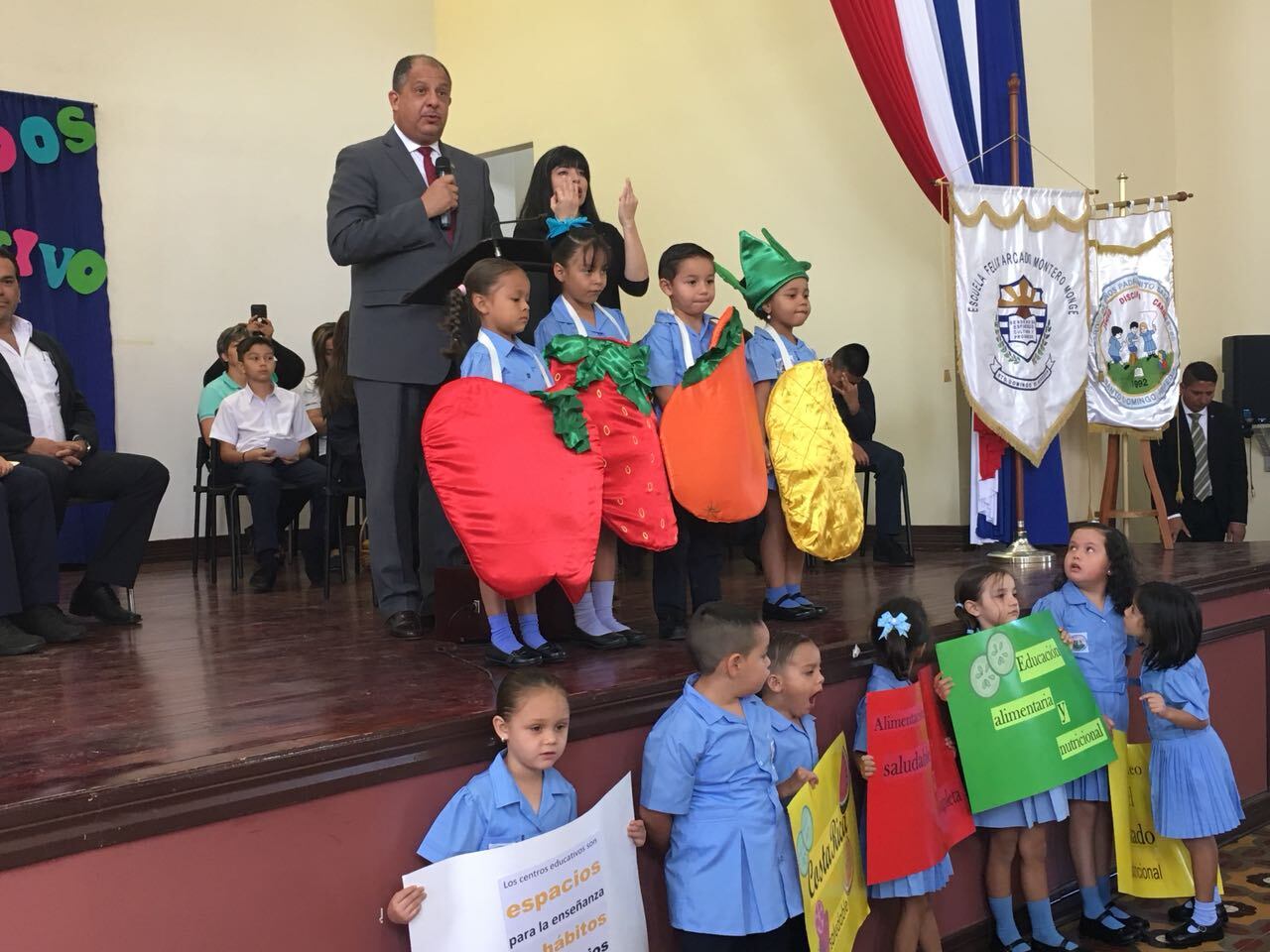 En el acto inaugural de este curso lectivo, estudiantes del Jardín de Niños Padre Benito Sáenz se disfrazaron de fresas y zanahorias para mostrarle al presidente por qué hay que comer cosas sanas.