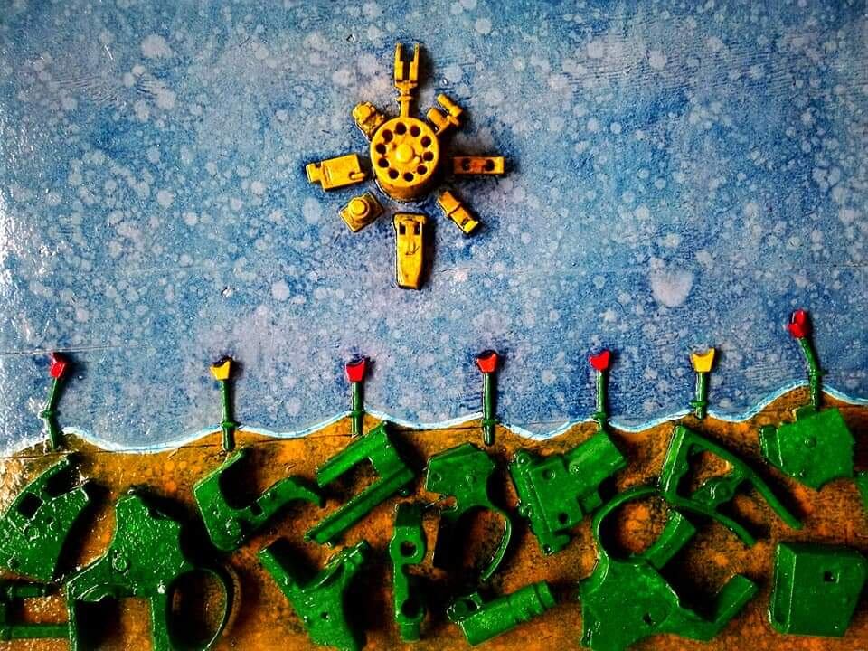 “Mi trabajo con la destrucción de armas arranca en el 2010 cuando me planteo hacer arte con trozos de armas. He usado cerca de una tonelada que fueron incautadas por la policía y que se usaron en hechos violentos, como robos y homicidios y me las donaron para hacer arte”, recordó el artista.
