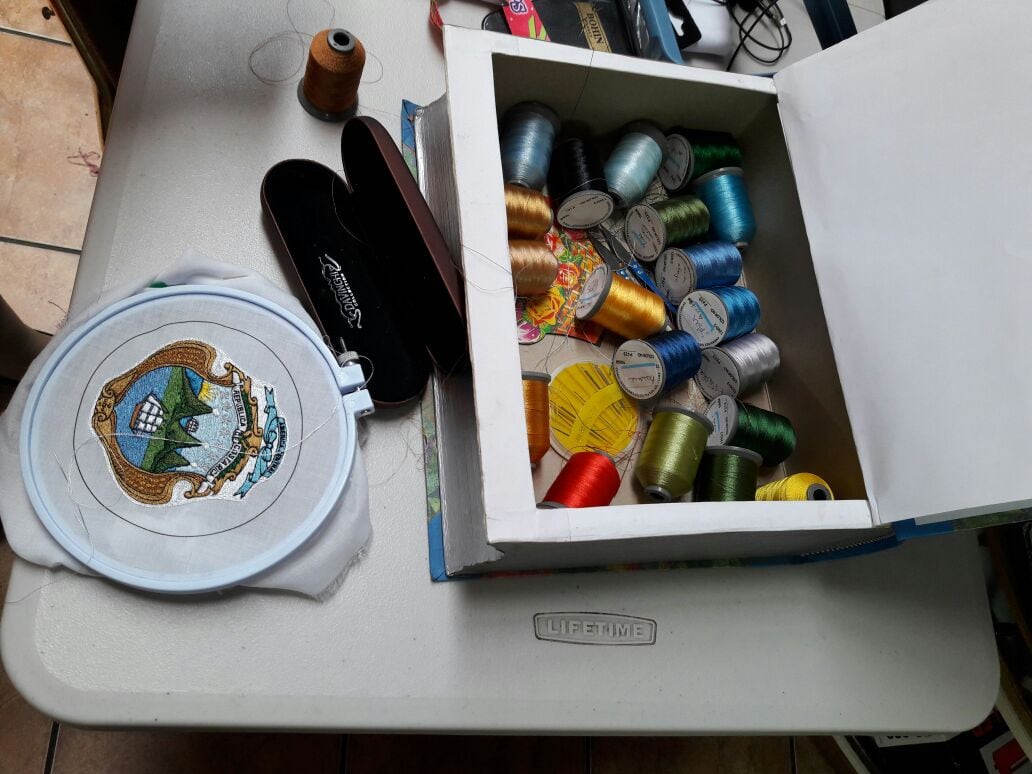 La segunda ronda fue el 1° de abril anterior, pero desde el lunes 22 de marzo doña Rosario comenzó con toda la logística, lo primero que hizo fue hacer el escudo serigrafiado; no tuvo que comprar los hilos porque le quedaron de hace cuatro años cuando bordó el de Luisgui, de hecho, los tenía la hermana, por eso el Domingo de Ramos, el 25 de marzo pasado, fue a recogerlos y al día siguiente se sentó bien tempranito a darle las primeras puntadas al escudo.