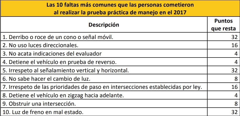 De las 52.622 personas que perdieron la prueba práctica de manejo, el año pasado, aproximadamente 13.155 golpearon un cono y con eso se les restó 32 puntos, perdiendo de inmediato el examen.