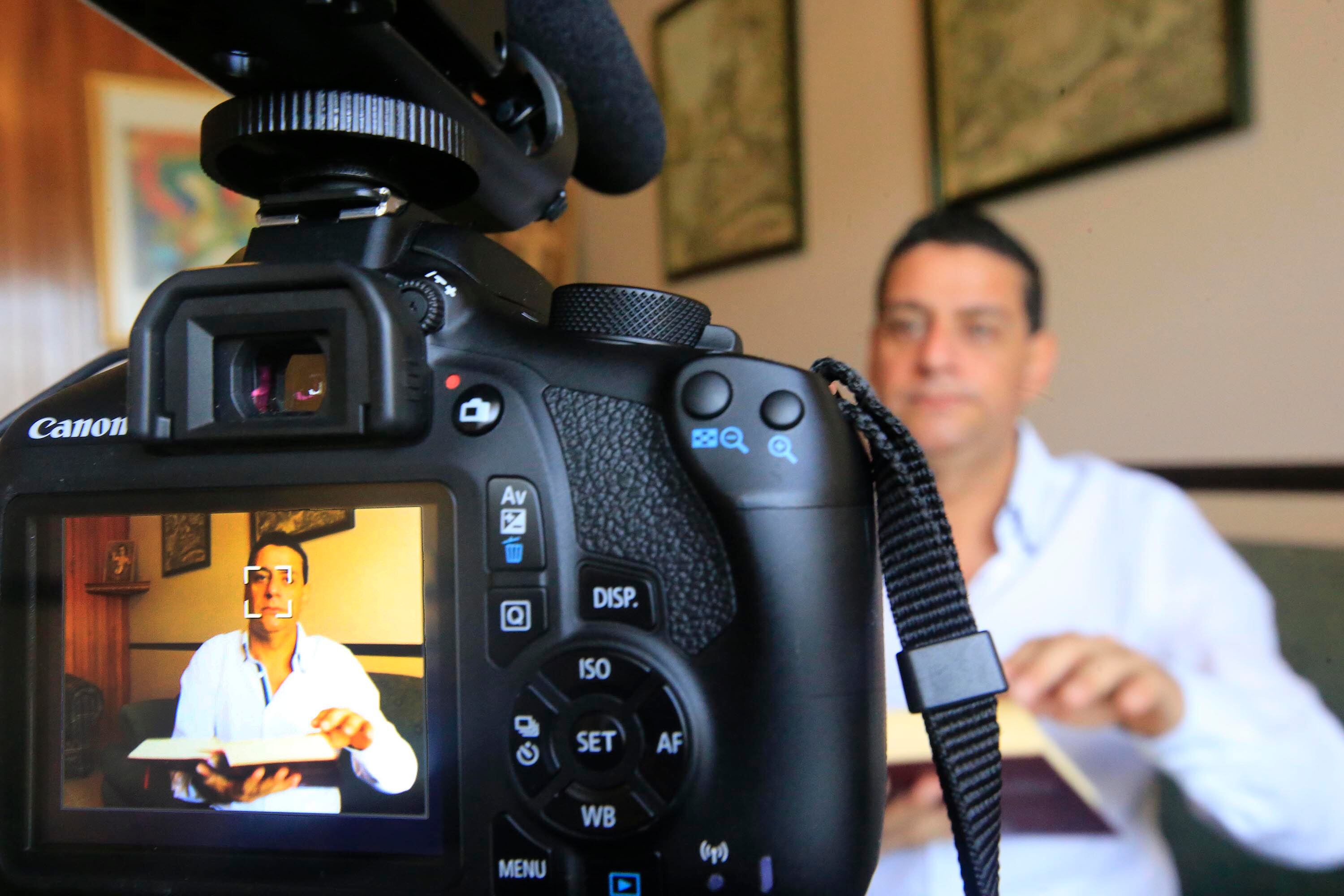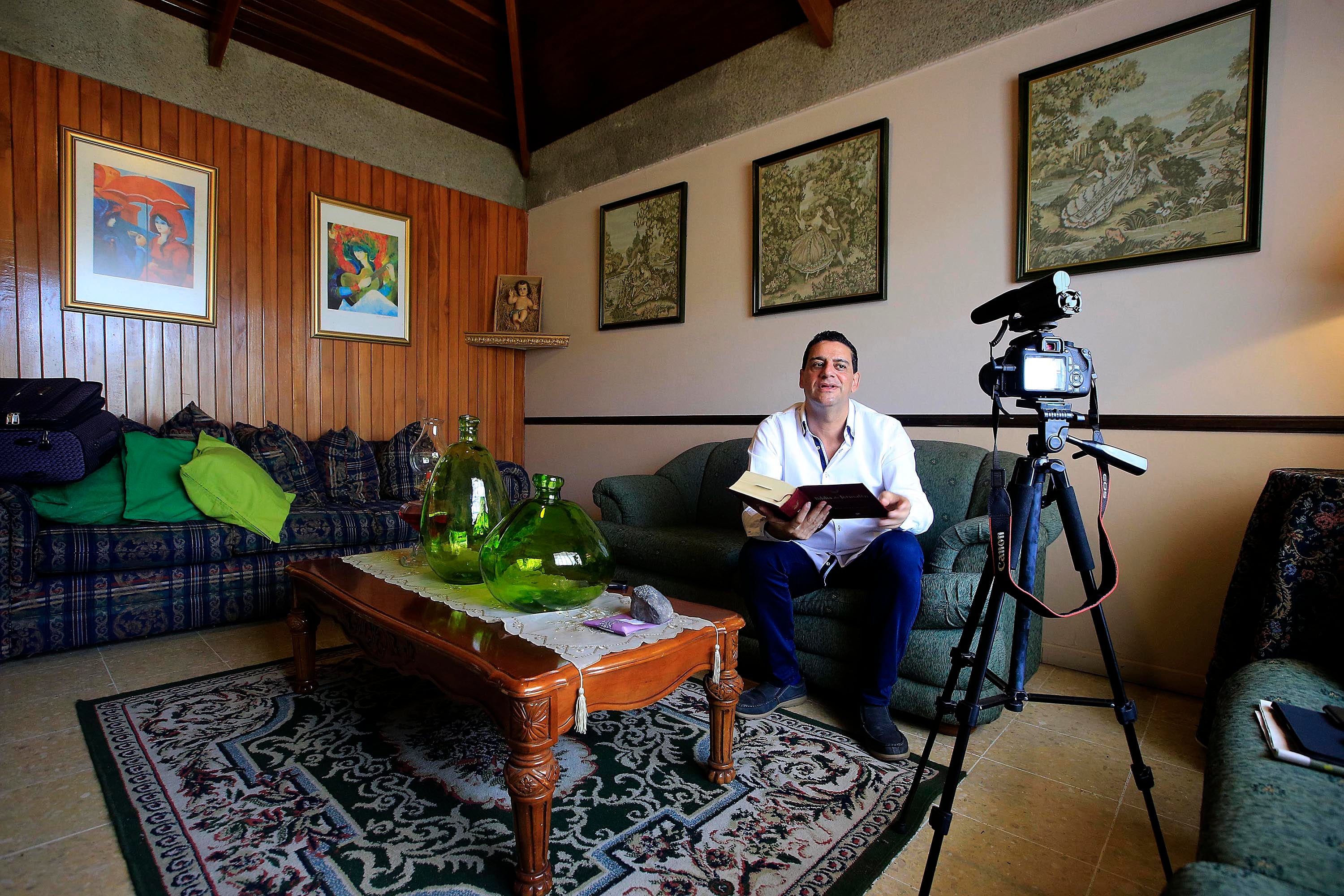 Una cámara en la sala de su casa y ¡acción! Así de sencillo arranca la grabación de las reflexiones que el padre Minor Calvo está transmitiendo en Facebook.