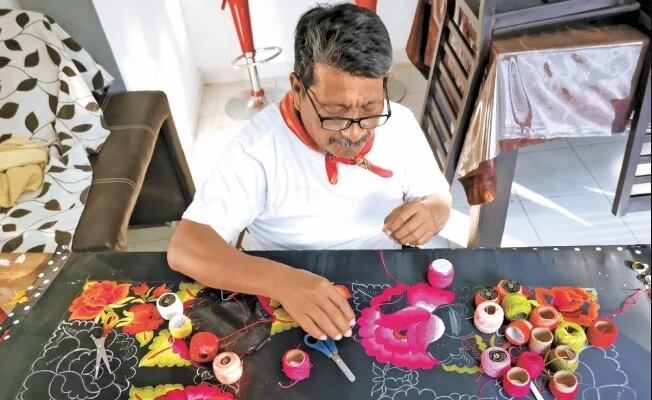 Aunque comenzó a bordar a los 20 años, cuenta que al igual que sus hermanos, aprendió el oficio de bordador a través de su esposa y por necesidad, pues los hilos siempre están ahí cuando no hay más trabajo.