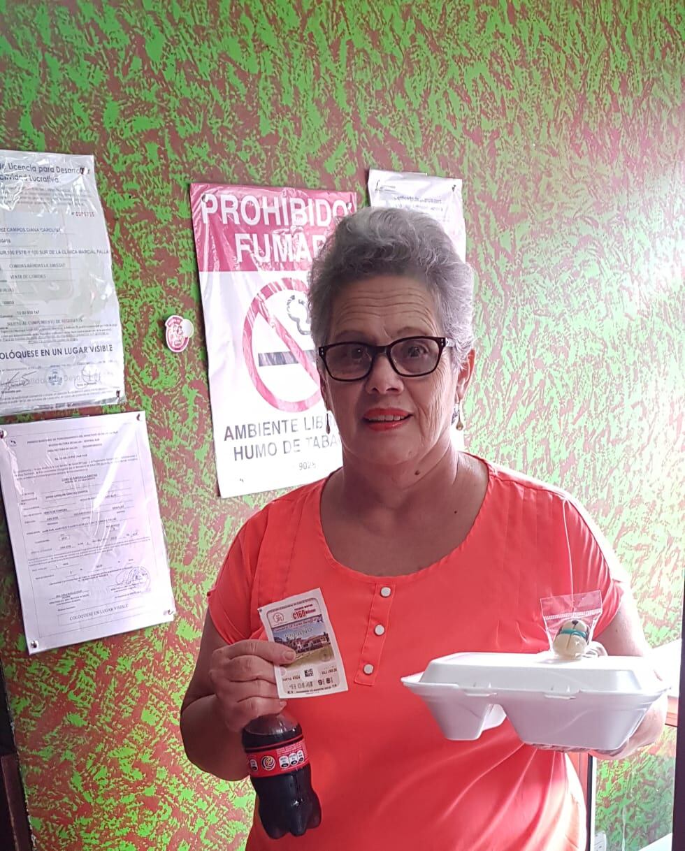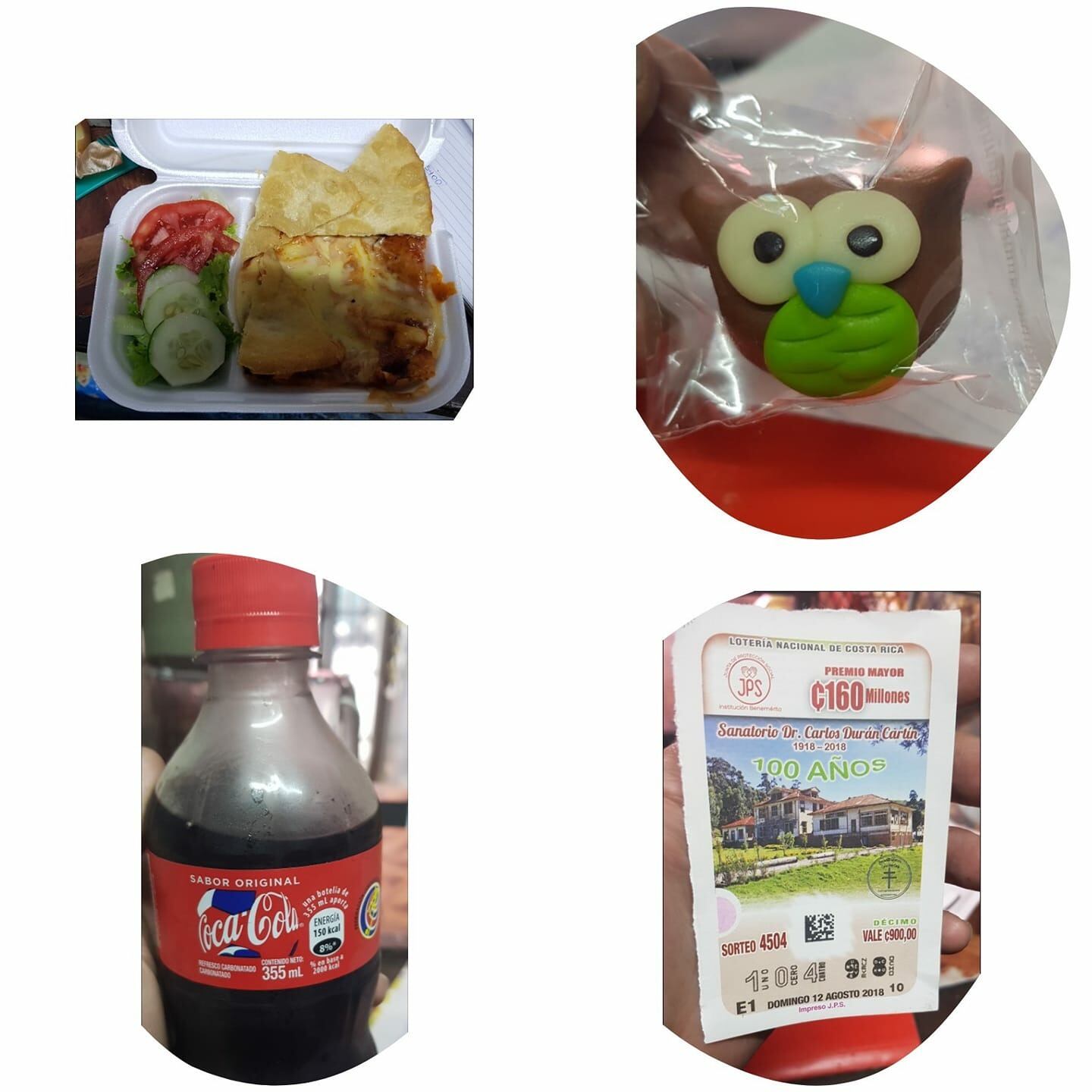 El premio consistía en un almuerzo de lasagna para llevar, una coquita de 355 mililitros, una cajetica y un pedazo de lotería para el sorteo de este domingo. El número es el 98 con la serie 104.