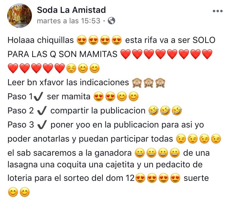 "Holaaa chiquillas. Esta rifa será SOLO PARA LAS QUE SON MAMITAS. Lean bien las indicaciones: