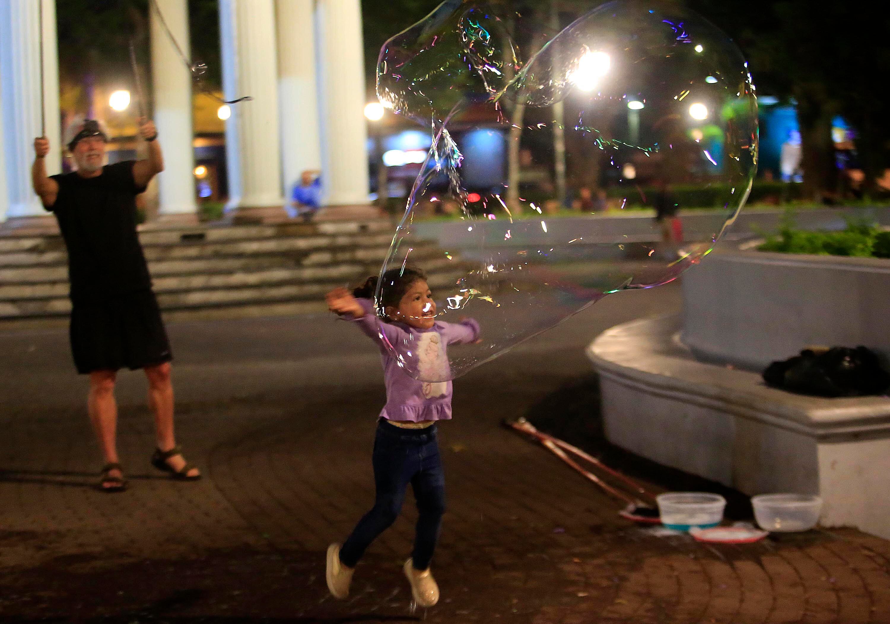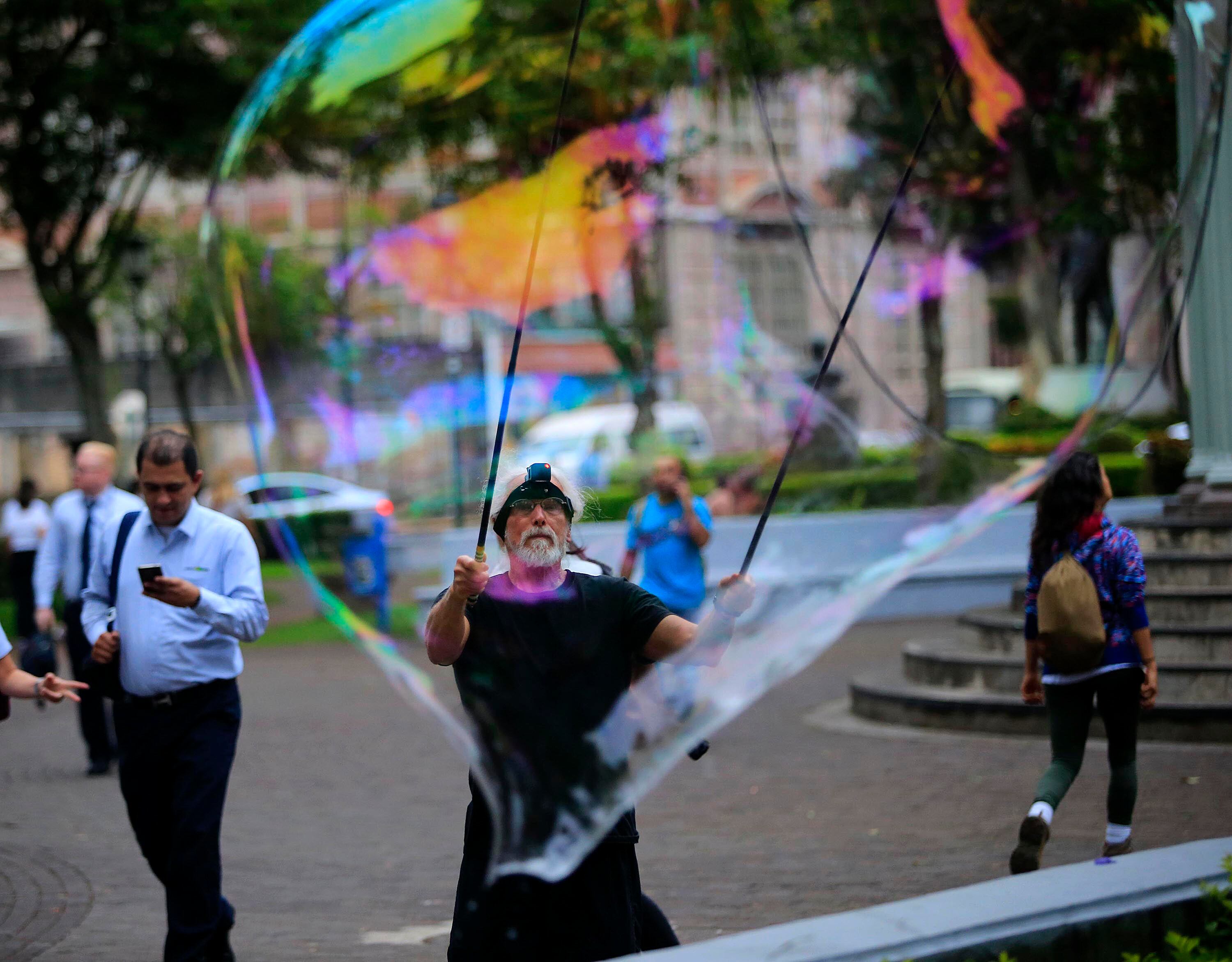 Hayes, de 69 años, llega con un par de cañas de pescar, las une con un mecate al que le da una forma redonda, utiliza un jabón especial traído de Gringolandia y con esto, hace bombas de jabón gigantes para su disfrute y el de los transeúntes.