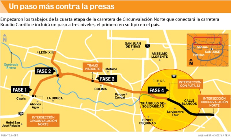 El tramo unirá Tibás con Calle Blancos e incluirá la construcción de tres pasos a desnivel. El primero de estos será único en el país porque contará con una rotonda, un paso a desnivel y una vía de 400 metros a cuatro carriles que conectará a Calle Blancos con la ruta 32 y el Triángulo de la Solidaridad.