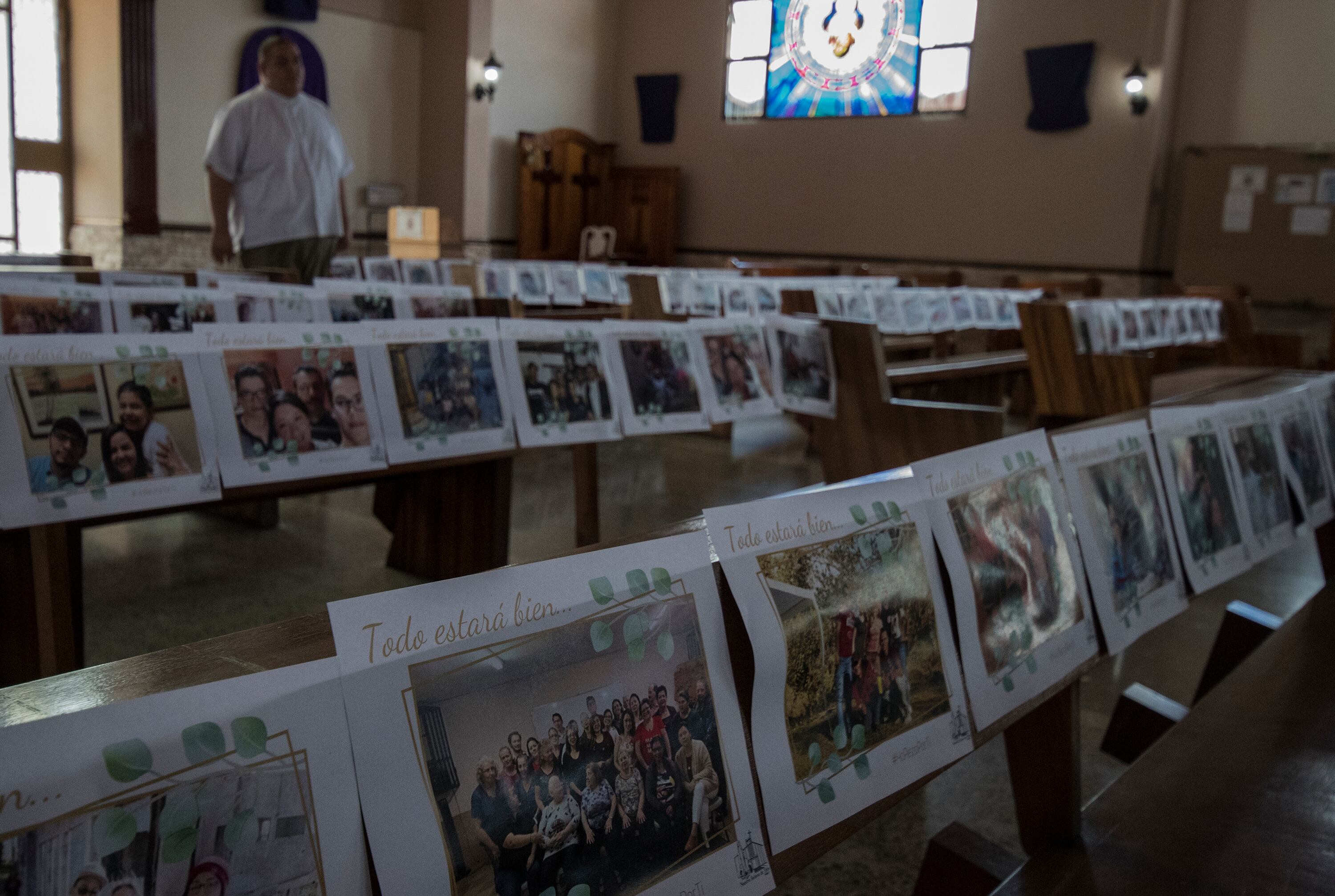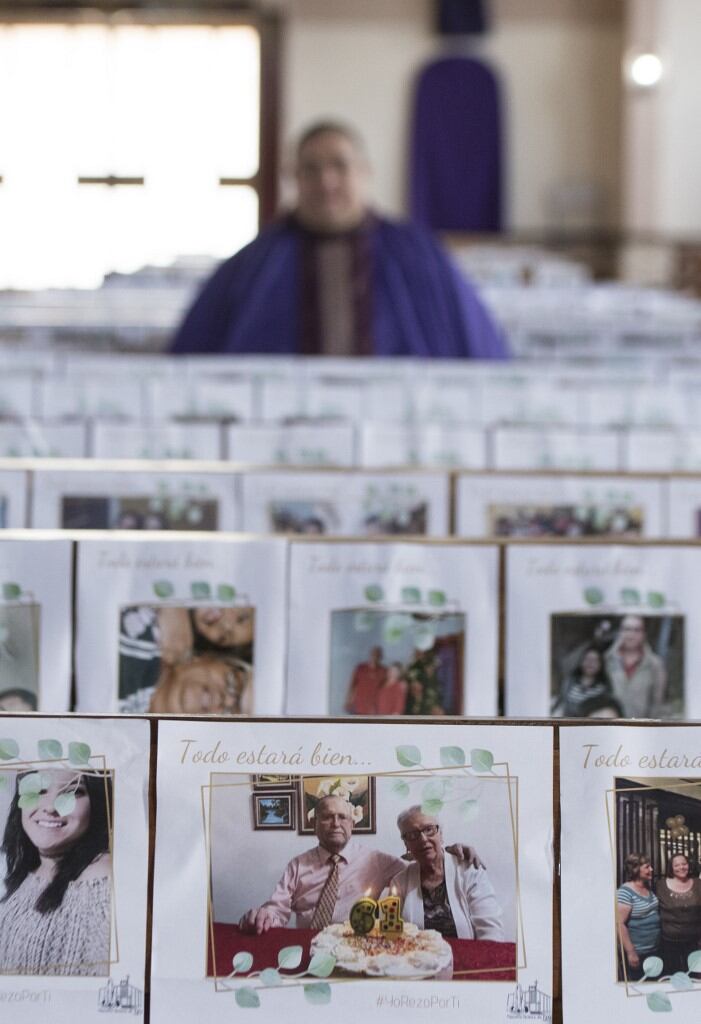 El sacerdote, a quien le dicen el padre Toto de cariño, se puso a coquear, junto con el grupo de comunicación de la parroquia, ideas para estos tiempos de coronavirus e iglesias cerradas, por lo que se le ocurrió pedirles a los feligreses que mandaran sus fotos familiares para pegarlas en las bancas.