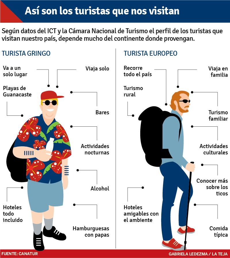 "Ellos prefieren hospedarse en hoteles todo incluido y disfrutan de actividades más de ambiente festivo, visitar las playas, especialmente guanacastecas; mientras los europeos viajan con sus parejas o hijos, se quedan en hoteles ecoturísticos, disfrutan el turismo rural que les permita interactuar con los habitantes de la comunidad", agregó Vargas.