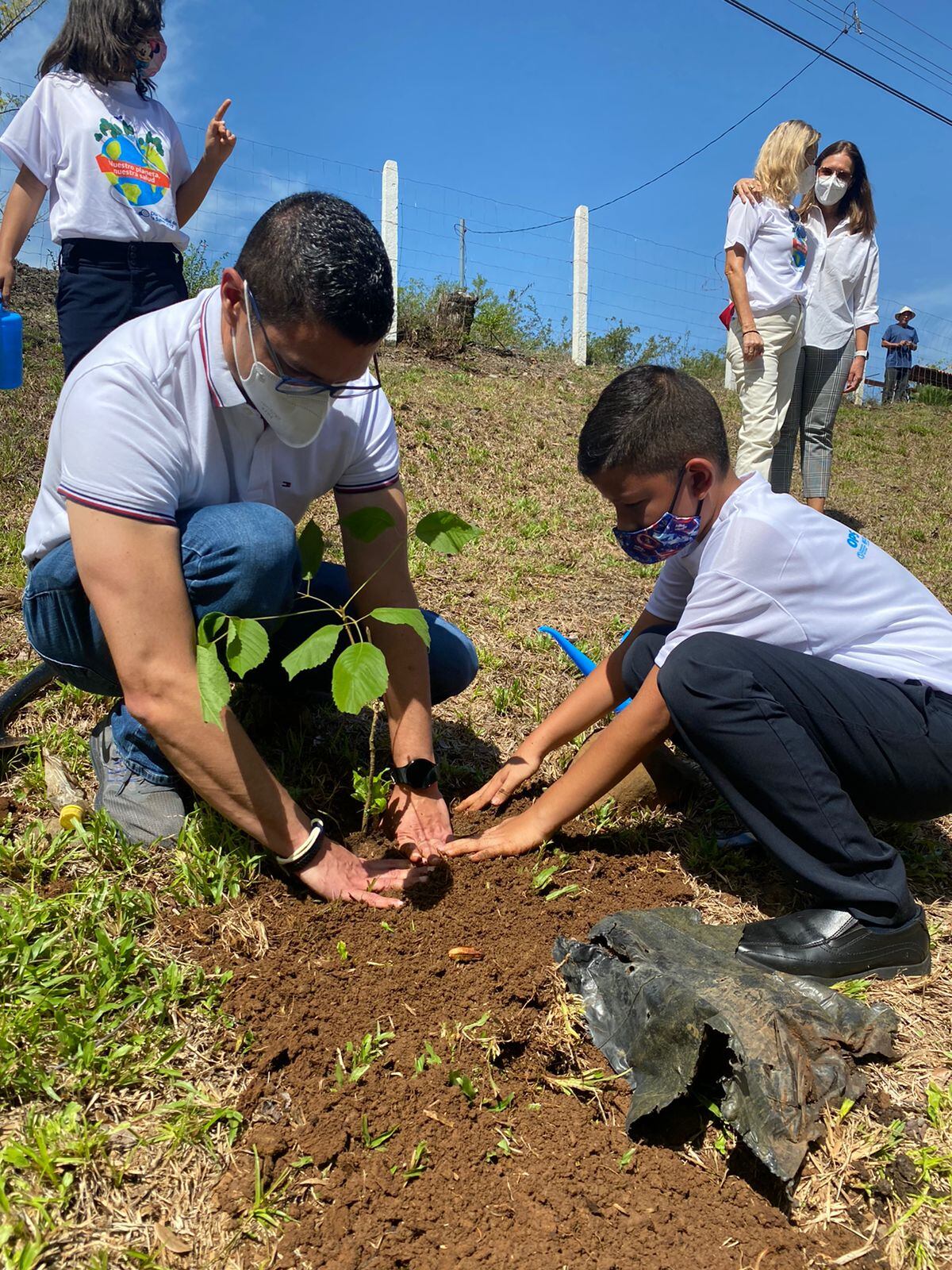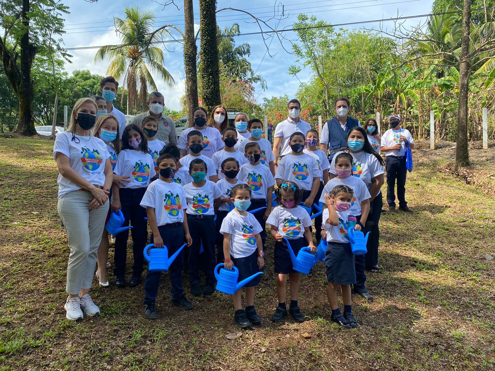 Además de las autoridades del Gobierno, participaron en la siembra de los árboles estudiantes de la Escuela Colonia San Francisco, a quienes se unió el ministro de Salud, Daniel Salas.