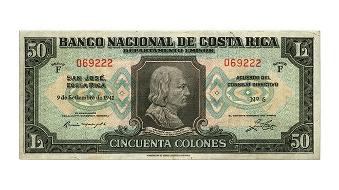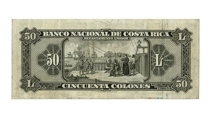 Los primeros billetes y monedas tenían un busto de Cristobal Colón y hubo un billete de 50 colones en el que se representaba el momento en el cual el navegante llegó a la isla Cariari (hoy Uvita) en 1502.