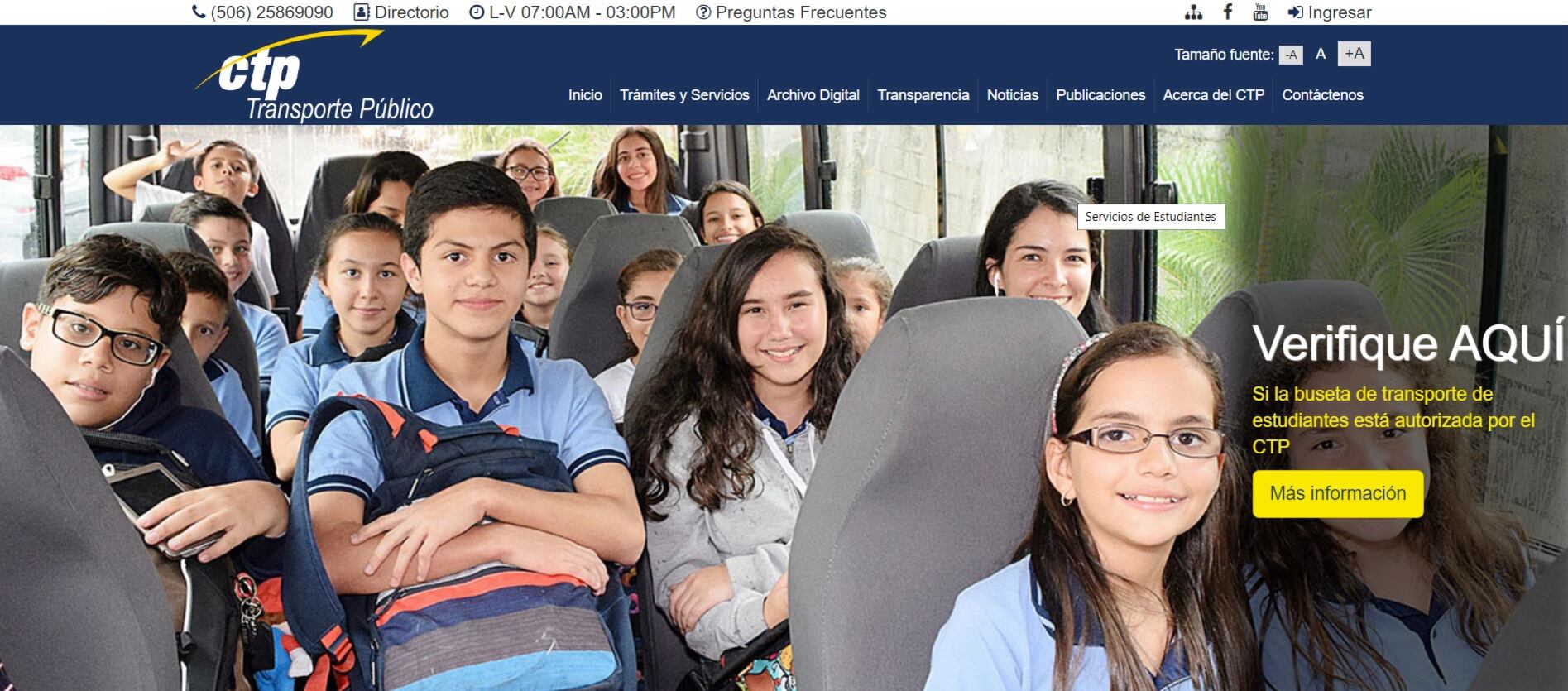 Para confirmar que todo está bien, don Manuel les recordó a los papás que ellos tienen a sus disposición herramientas como la página www.ctp.go.cr en la cual está habilitada una herramienta para que confirmen si la buseta en que viajan sus hijos tiene los permisos al día con solo escribir la placa. Otra forma es llamar al 2586-9090, en caso de presentar alguna denuncia por irregularidades.
