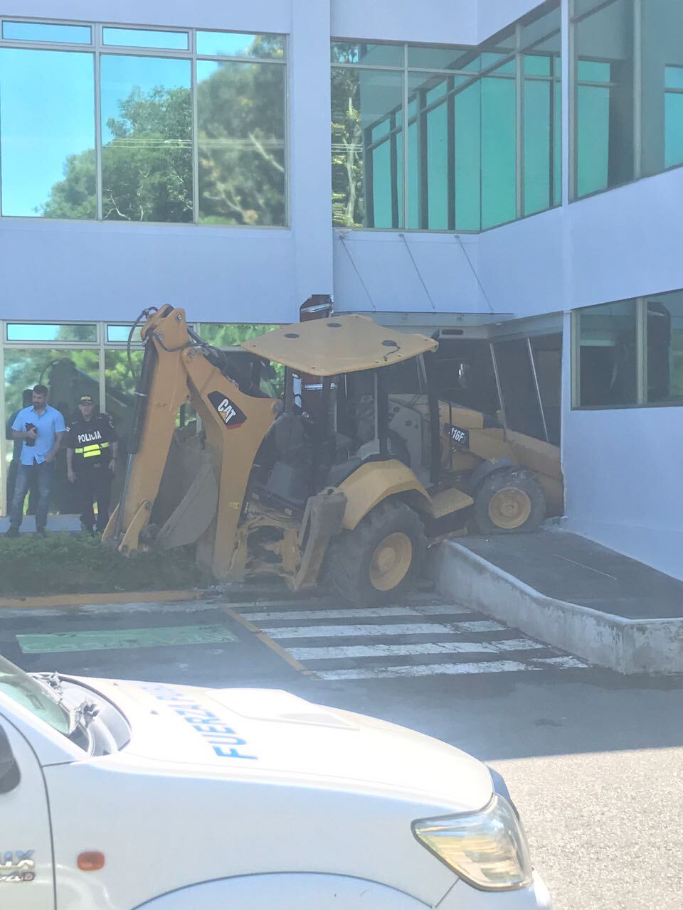 En la escena quedó un backhoe (máquina excavadora) que usaron para arrearle a una oficina en la planta baja, ocasionando daños en una puerta de vidrio.