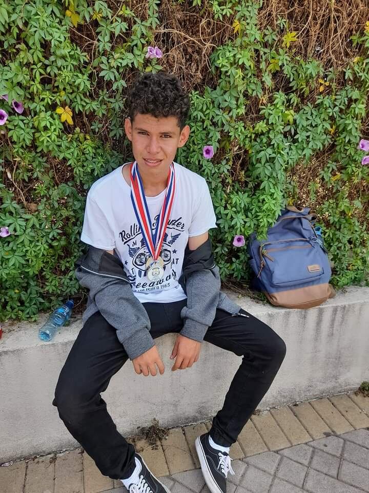 Este joven es tan buen deportista que ganó dos medallas en una competición de atletismo en el cole.