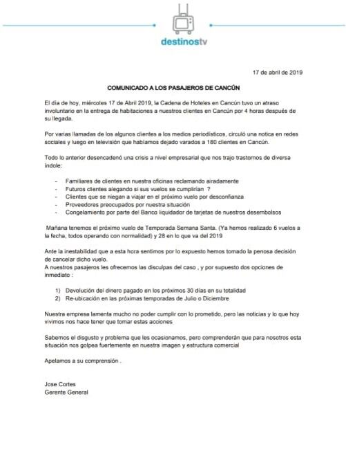 Destinos TV le comunicó a los afectados que ante lo sucedido que tienen dos opciones, una es que les devuelvan el dinero pagado en un plazo de 30 días o la reubicación de sus vacaciones en las próximas temporadas de julio o diciembre.