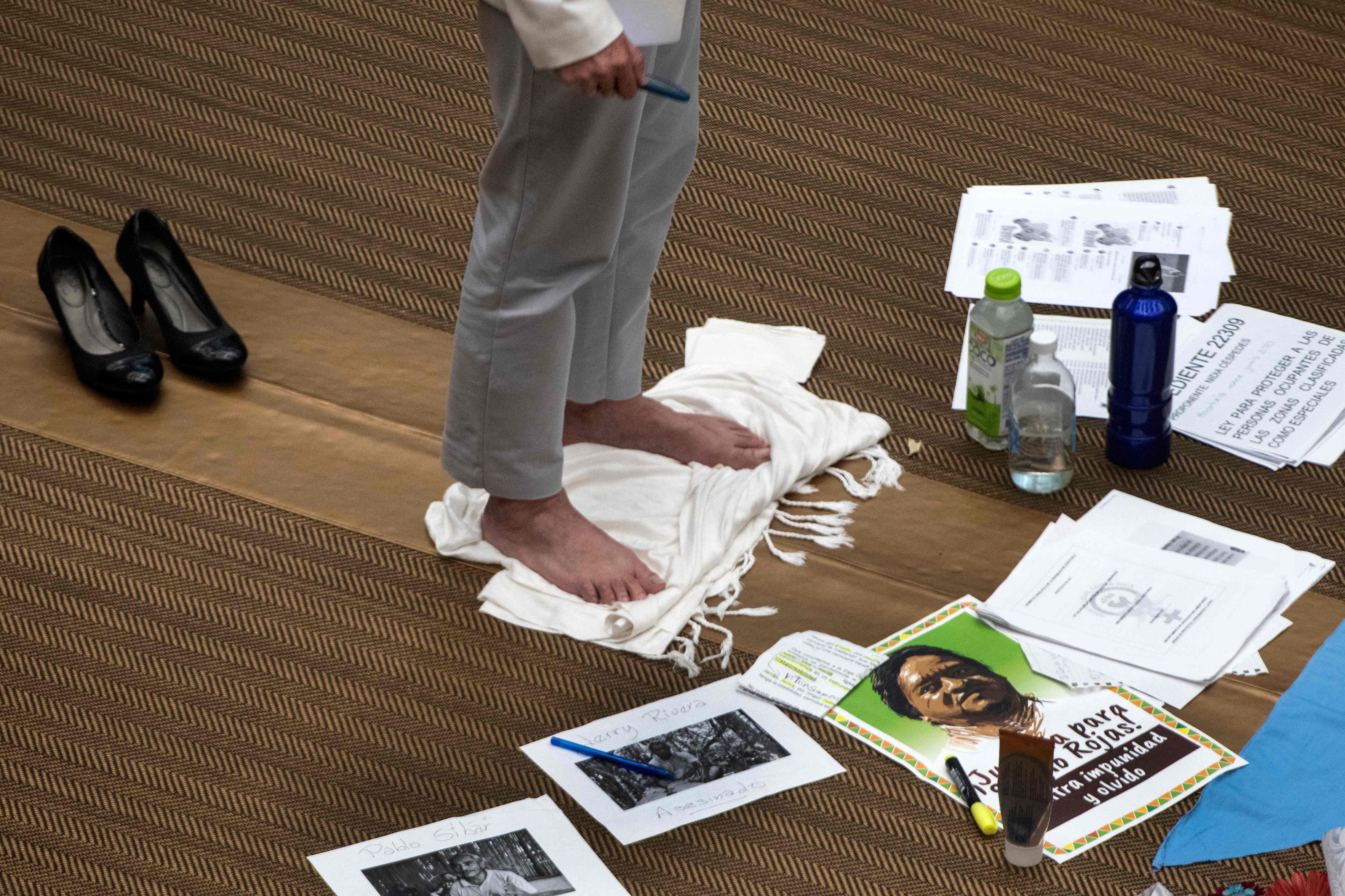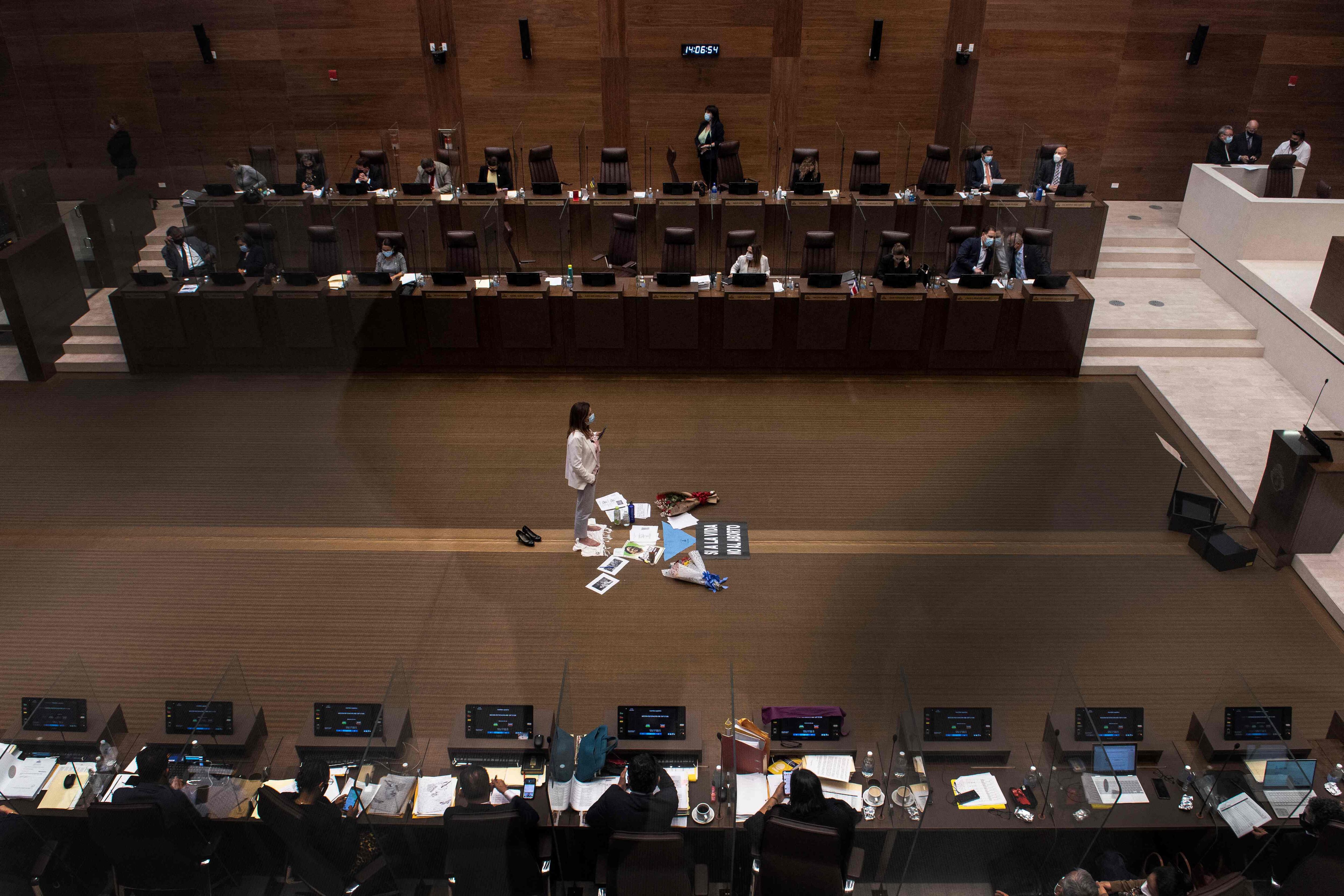 La diputada está sin zapatos y participa de las sesiones desde el centro del plenario. Luego pasa la noche allí hasta el día siguiente, cuando se reanudan las labores, comentó.