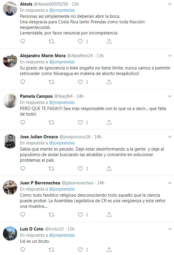Mientras Leonardo Garnier afirmó: “Lo que irresponsablemente afirma el diputado Jonathan Prendas sobre los riesgos del embarazo, y lo que le responde @leochacon, un médico con experiencia en el tema, muestran lo grave de que personas desinformadas tomen decisiones vitales para otras personas”.