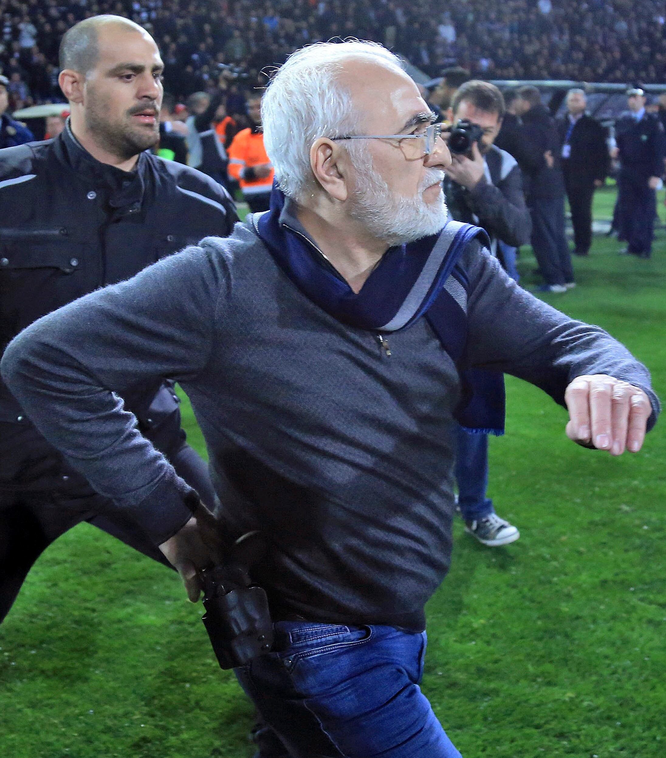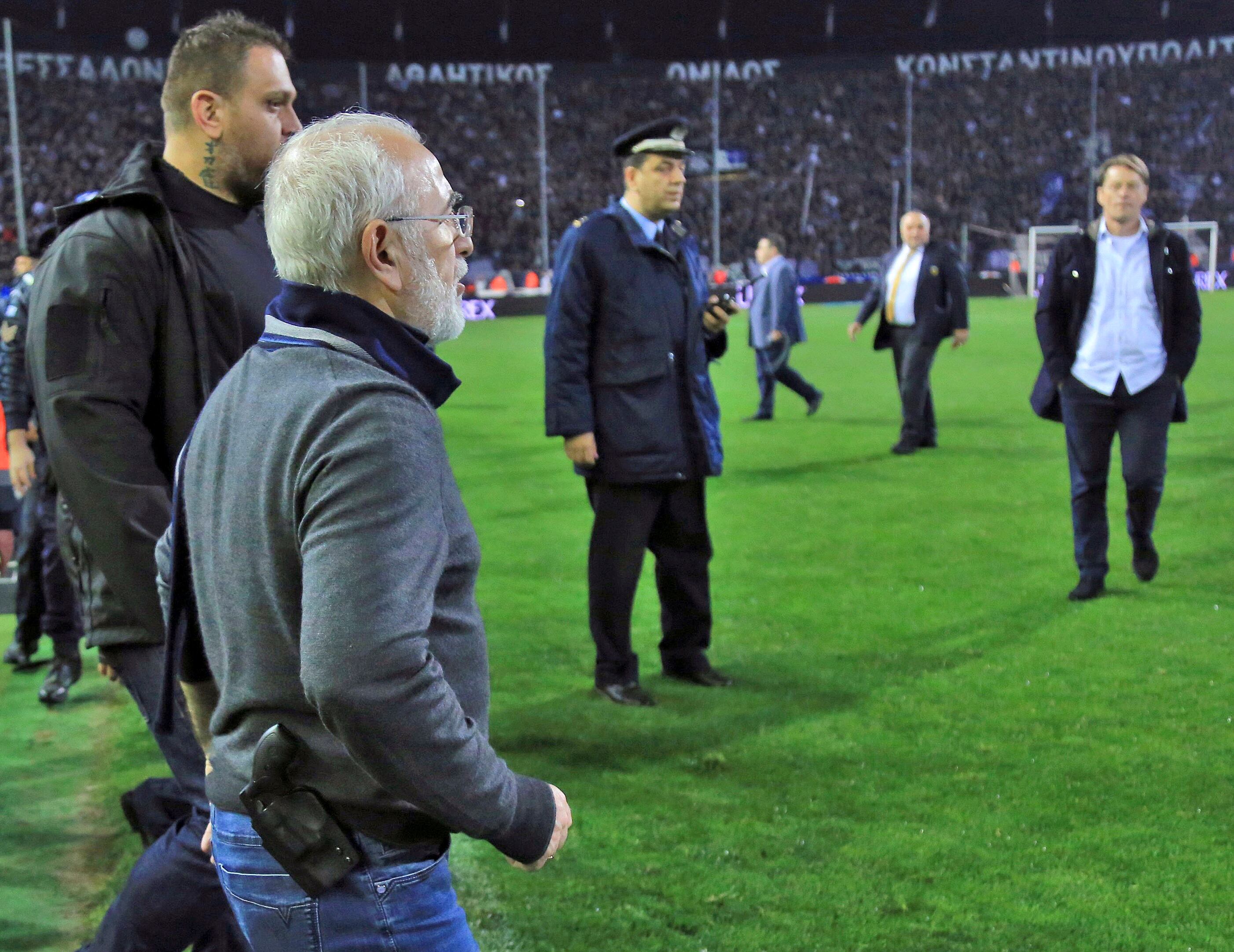 El dueño del club PAOK, el empresario Ivan Savvidis, ingresó dos veces a la cancha acompañado por sus guardaespaldas. En la segunda ocasión lo hizo sin el abrigo que vestía la primera vez, por lo que se notó que entró con una pistola enfundada.