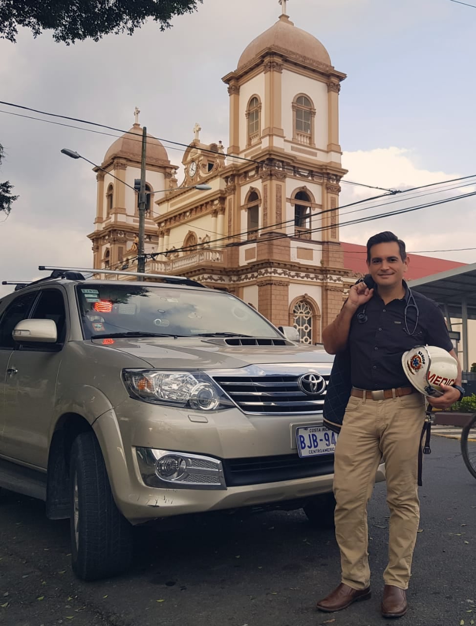 Quesada trabaja en el hospital de San Ramón y al terminar su turno a las cuatro de la tarde, mientras va en su carro, que tiene equipado con sirena, luces de emergencia y equipo especializado, enciende la frecuencia de emergencias para ver en cuál puede colaborar.