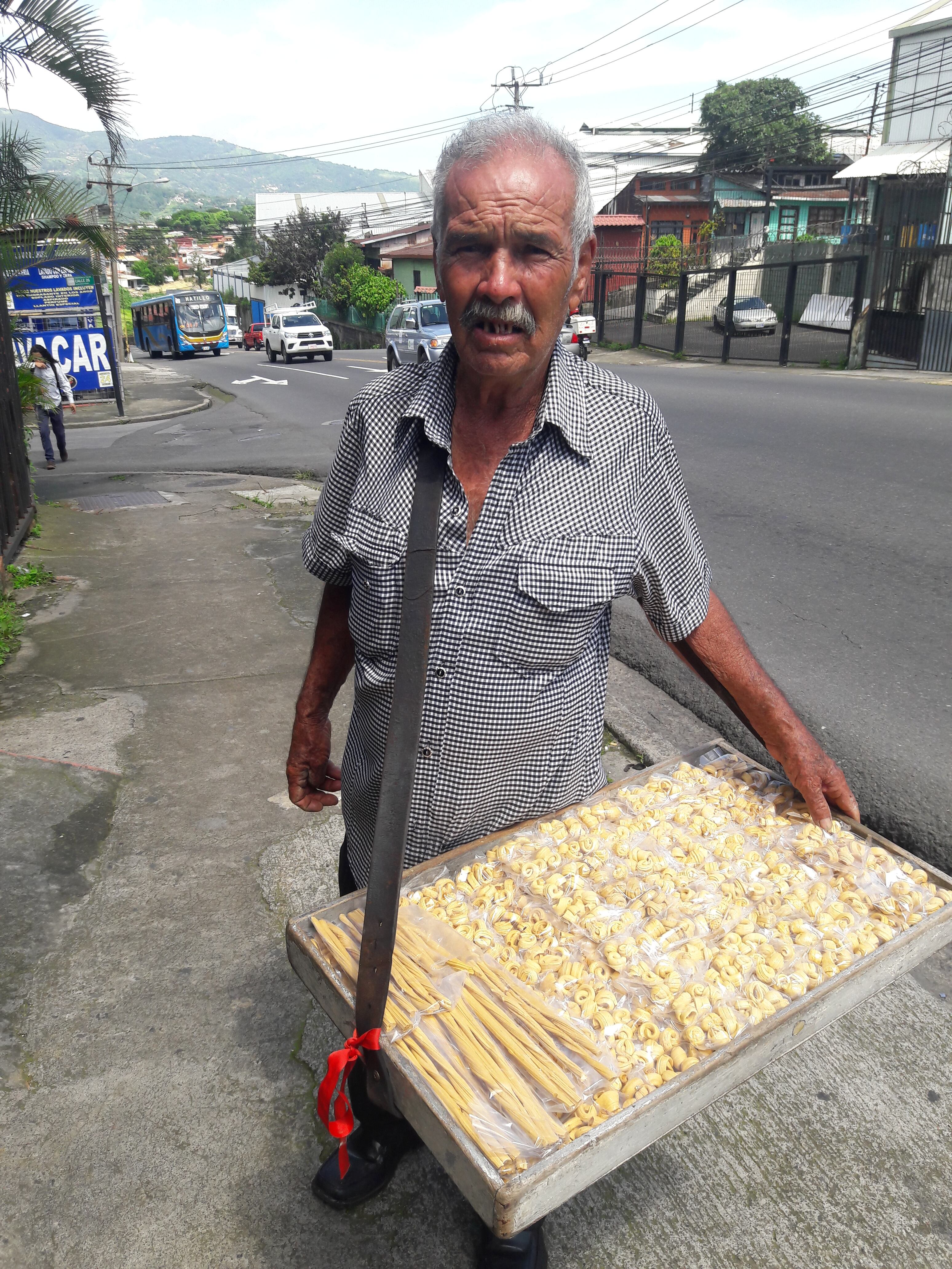 Años atrás salía muy tempranito, pero como los hábitos de los josefinos han cambiado se dio cuenta, en los últimos diez años, de que ya nadie compra temprano. Por eso a las diez de la mañana comienza su jornada, a eso del mediodía no perdona el almuercito en el Mercado Central y ya como a las cuatro de la tarde va para la casa con la alegría del trabajo cumplido.