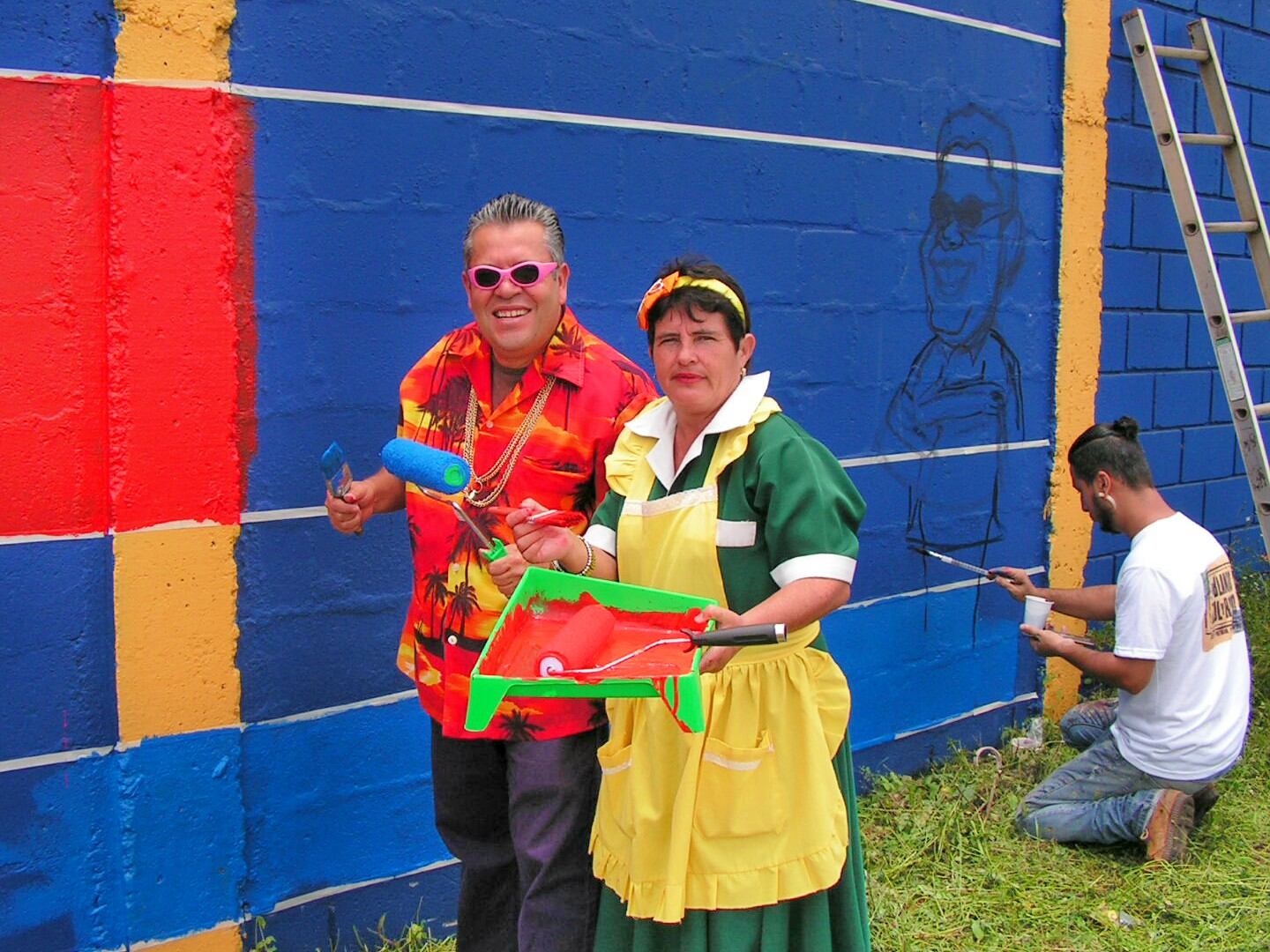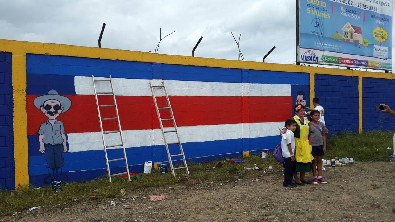 El colorido personaje, interpretado por Édgar Cartín, comenzó este miércoles el proyecto "De blanco, azul y rojo" con el que pretende llenar de color y de arte muchas comunidades del país mediante gracias a los murales.