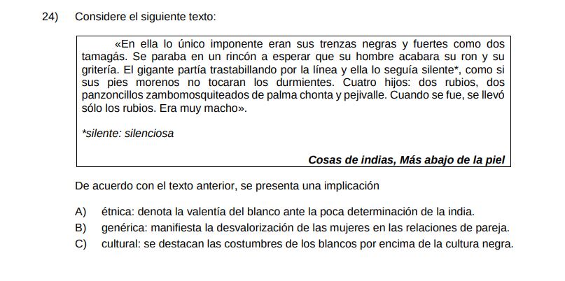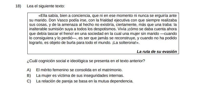 Otro de los textos incluidos en las pruebas es el de “La ruta de la evasión” que dice lo siguiente: “Ella sabía, bien a conciencia, que ni en ese momento ni nunca se erguiría ante su marido. Don Vasco podía irse, con la frialdad ejecutiva con que siempre realizaba sus cosas, y de la amenaza al hecho no existiría, ciertamente, más que una traba: la inalterable sumisión suya a todos los despotismos. ¡Cómo se daba cuenta ahora que debía tascar el freno! en una sociedad en la cual una mujer sin marido —cuando lo consiguiera y lo perdió—, es ser que jamás se reconstruye, y cuando no ha podido lograrlo, es objeto de burla para todo el mundo. ¡La solterona!”