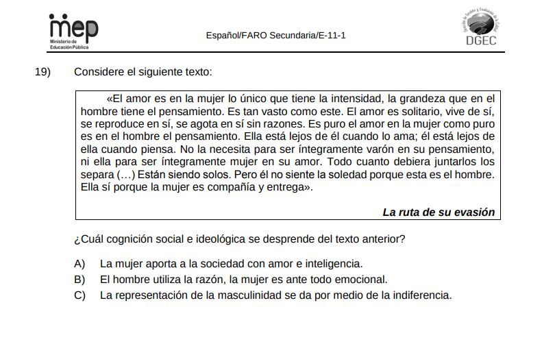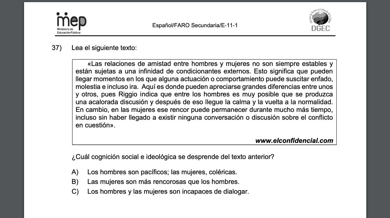 “Los ítems requieren por parte del estudiantado identificar elementos de cognición social (lo que entiende la sociedad) e ideológica, esta se define como creencias, estereotipos y sesgos, que se reproducen socialmente, por lo que implica evidenciar diferentes prejuicios, o ideas estereotipadas sobre determinados grupos, no para reproducirlas, sino de visualizarlos desde una posición crítica”, es parte de la respuesta escrita que envió el MEP y que fue atribuida a la viceministra administrativa María Alexandra Ulate.