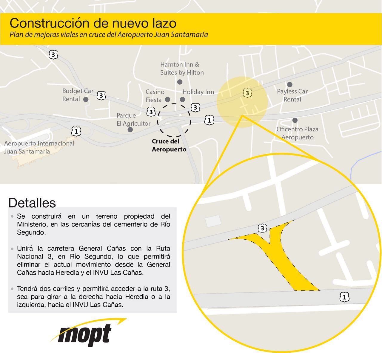 También habló sobre la construcción de un ingreso nuevo que unirá la autopista General Cañas con la ruta nacional 3, en Río Segundo, la cual permitirá eliminar el actual giro desde la General Cañas hacia Heredia y la del INVU Las Cañas, que se encuentra en el semáforo del cruce del Aeropuerto.