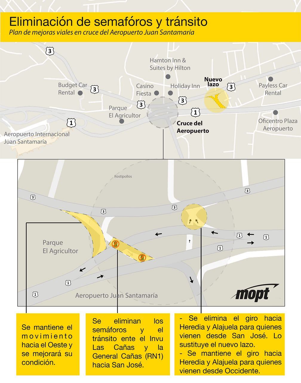 Además se eliminará el giro hacia Heredia y Alajuela en los semáforos del aeropuerto, pues esos movimientos, para quienes vienen de San José, se podrán hacer en ese nuevo ingreso. Para quienes vienen de Grecia, Naranjo, El Coyol, por ejemplo, sí podrán girar hacia Heredia y Alajuela, en las cercanías de los semáforos del cruce del Aeropuerto, ya que se darán algunas mejoras en el movimiento.