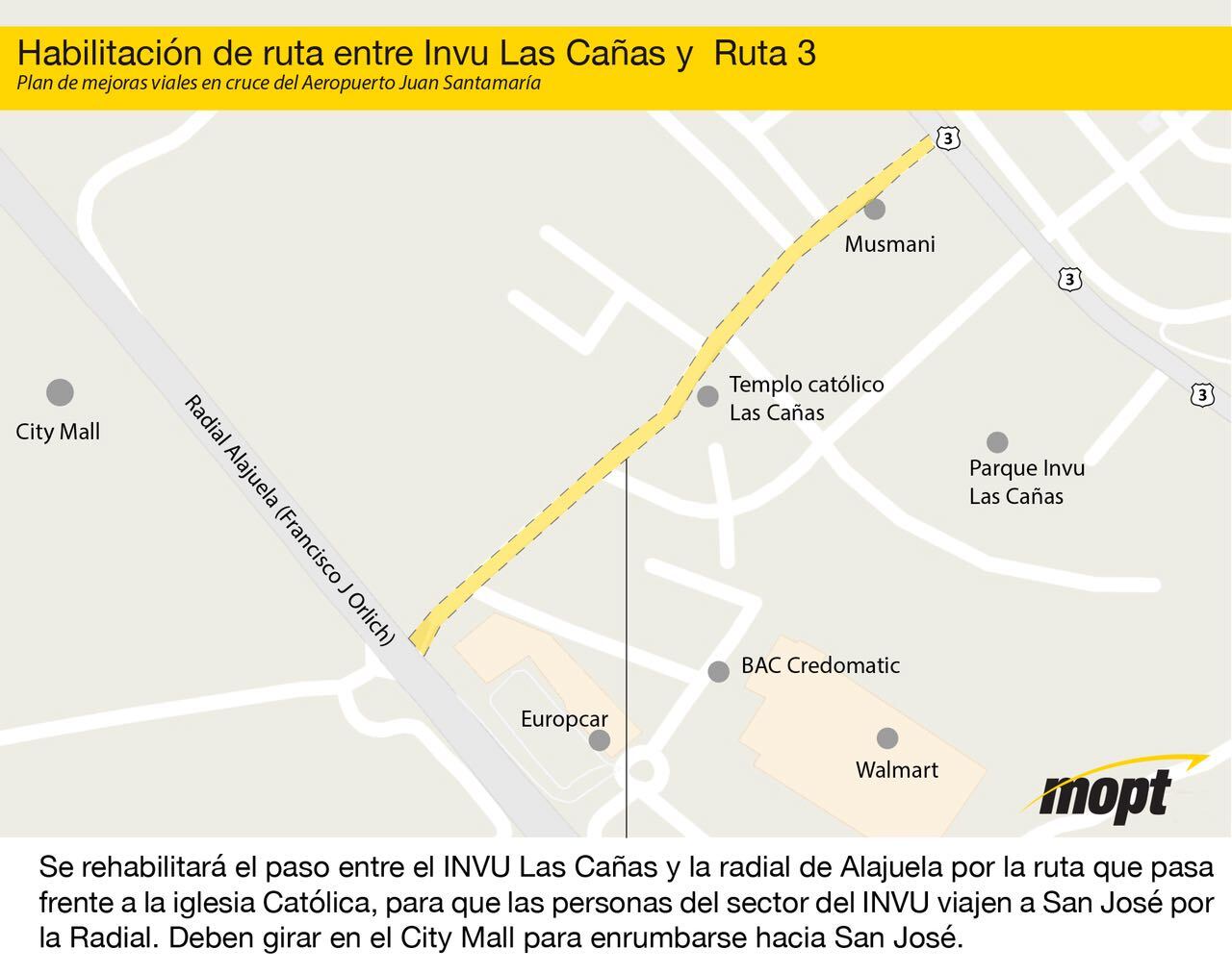 Las personas que viajen desde INVU Las Cañas a San José deberán hacerlo por la radial de Alajuela, o radial Francisco J. Orlich, gracias a la rehabilitación que se hará de una calle cantonal, que pasa frente a la iglesia católica Las Cañas. Al llegar a la radial, los conductores deberán continuar hacia el norte y hacer el giro frente al City Mall, para tomar el sentido de circulación hacia el aeropuerto.