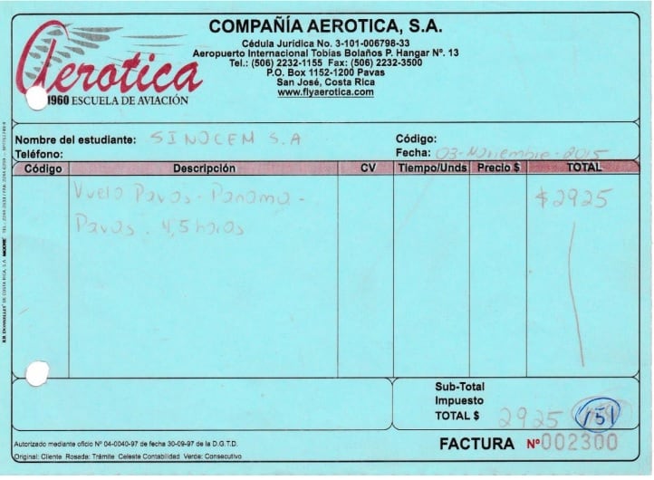 Por si fuera poco, existe una tercera factura, a nombre de Sinocem, donde paga $2.925 (¢1.673.100) en un viaje entre Pavas – Panamá – Pavas, que duró 4,5 horas, del 3 de noviembre del 2015. Ese vuelo tampoco está registrado por Aviación Civil.