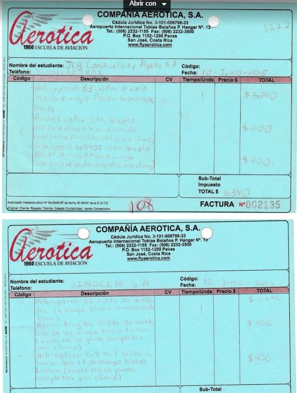 Pero si eso le huele feo, ¿qué me dicen de un viaje a Limón por $200 (¢114 mil) en una avioneta King Air, que según la factura, fue suspendida por mal tiempo el mismo 26 de mayo? Sin embargo, pese a que el vuelo se suspendió, la factura está cancelada. ¿Usted pagaría un servicio que no le dieron?