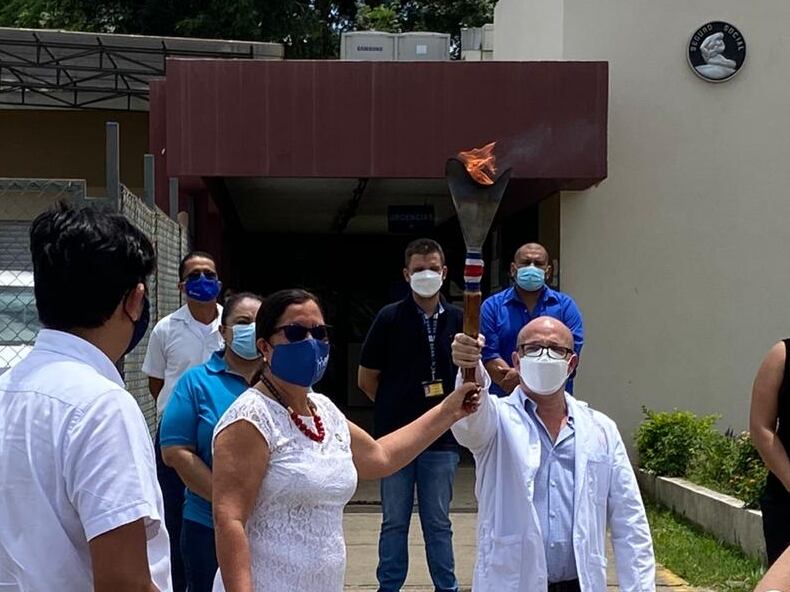Los encargados de encender el pebetero con la llama de la libertad son dos funcionarios de salud. Marco Vargas, jefe del Centro de Atención Especializado para Pacientes con Covid-19 (Ceaco), y Nancy Durán, enfermera del hospital Max Peralta.