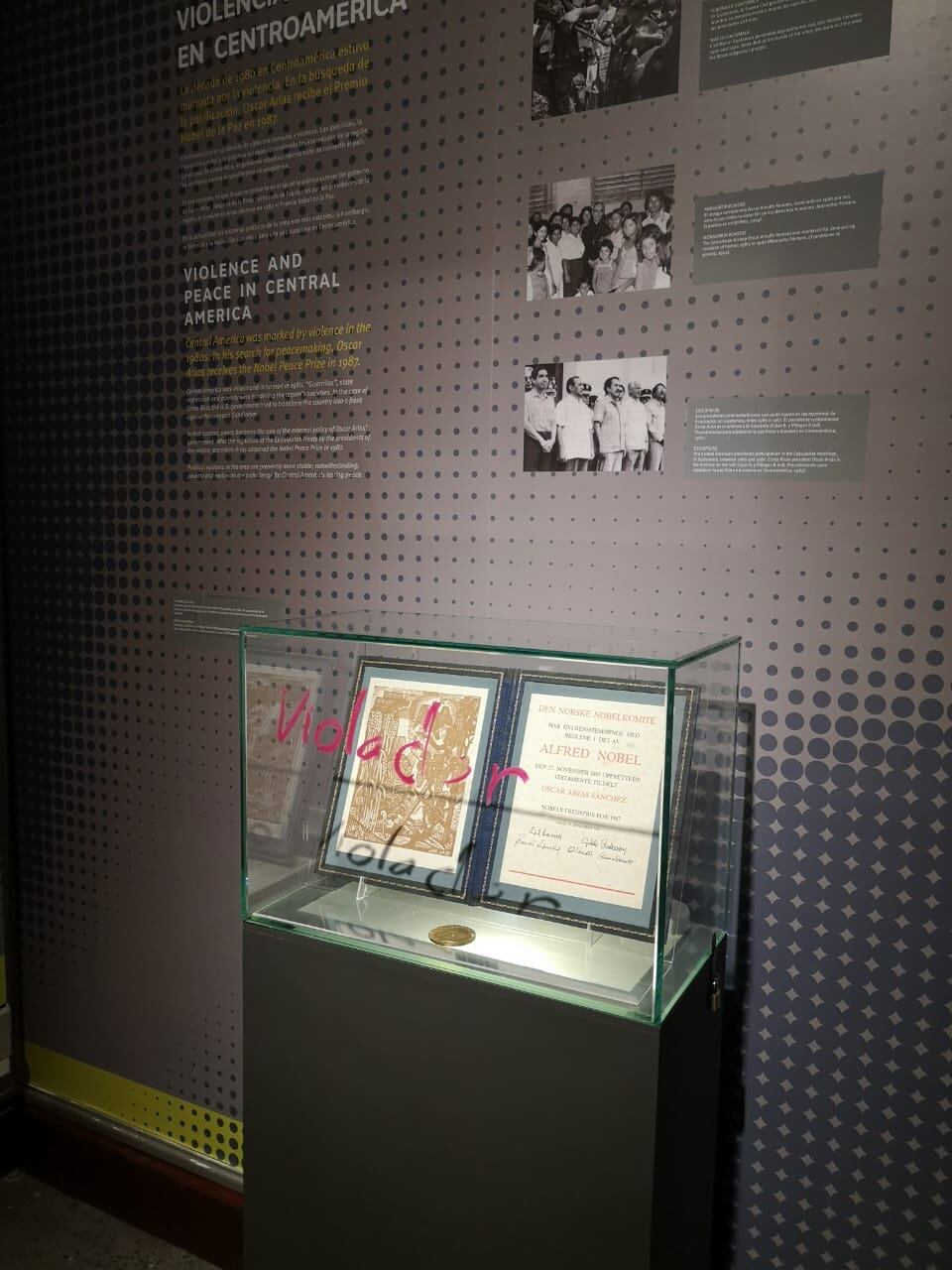 El colectivo artístico Cacao Cash se atribuyó haber rayado con lápiz de labios la palabra “violador” en la vitrina que resguarda la réplica de la medalla del Premio Nobel de la Paz que recibió el expresidente Óscar Arias, la cual se ubica en el Museo Nacional.