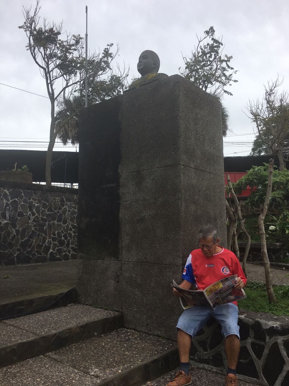 Este lunes nos topamos de nuevo a don Mario Felipe Guerrero cerca del busto que honra la memoria de José María "Billo" Zeledón, autor de la letra del Himno Hacional y a quien "ahorcaron" la semana pasada con cables que usaban para llevar corriente a unos chinamos de las fiestas en el parque de Curridabat.