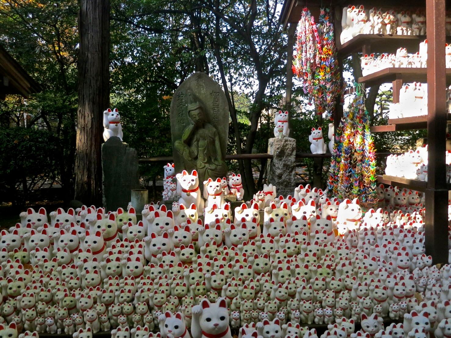 El templo tiene cerca de 10.000 figuras de estos gatos blancos, llamados ‘maneki-neko’, inspirados en la raza bobtail. Siempre aparecen sentados y saludando con una pata que a veces se mueve, como los que presiden muchos restaurantes y tiendas asiáticas.