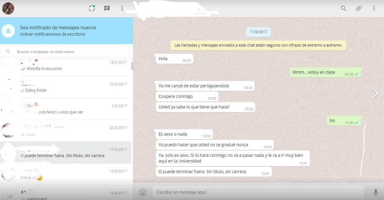 En la denuncia, la joven aportó como prueba pantallazos de una conversación por Whatsapp en la cual se puede leer la forma en que la joven es acosada, pero la prueba no fue dada por válida por la universidad.