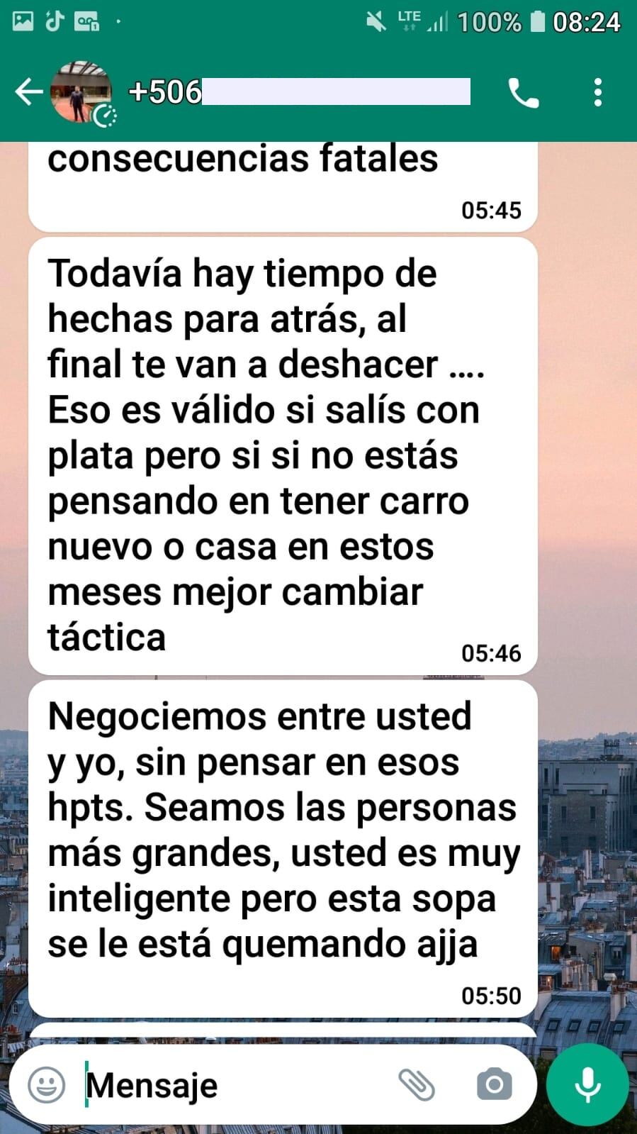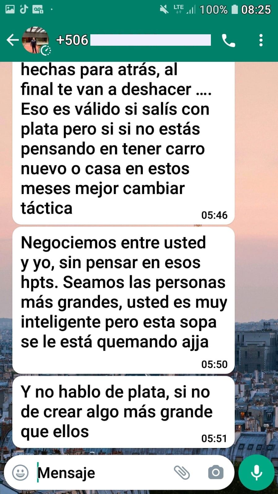 “Todavía hay tiempo de echar para atrás, al final te van a deshacer... Eso es válido si salís con plata, pero si no estás pensando en tener carro nuevo o casa en estos meses, mejor cambiar táctica. Negociemos entre usted y yo, sin pensar en esos hpts. Seamos las personas más grandes, usted es muy inteligente, pero esta sopa se le está quemando. Y no hablo de plata, sino de crear algo más grande que ellos”, se detalla en los mensajes enviados a Alberto, quien asegura que prefirió no responderle al exasesor.