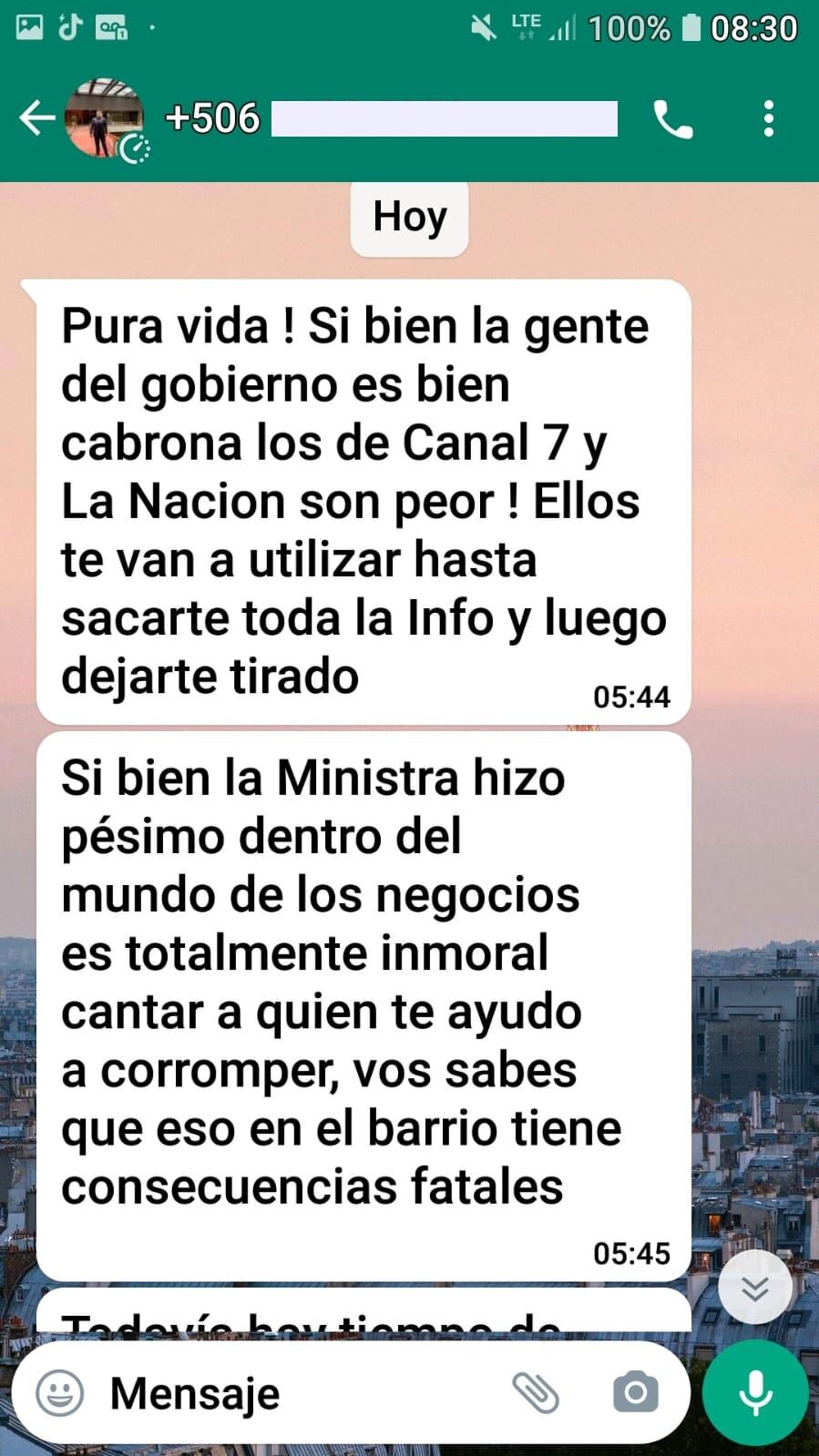 Alberto compartió con La Teja pantallazos de los mensajes que le mandó Blumberg y en algunos habla mal de la ministra de Salud, Joselyn Chacón.