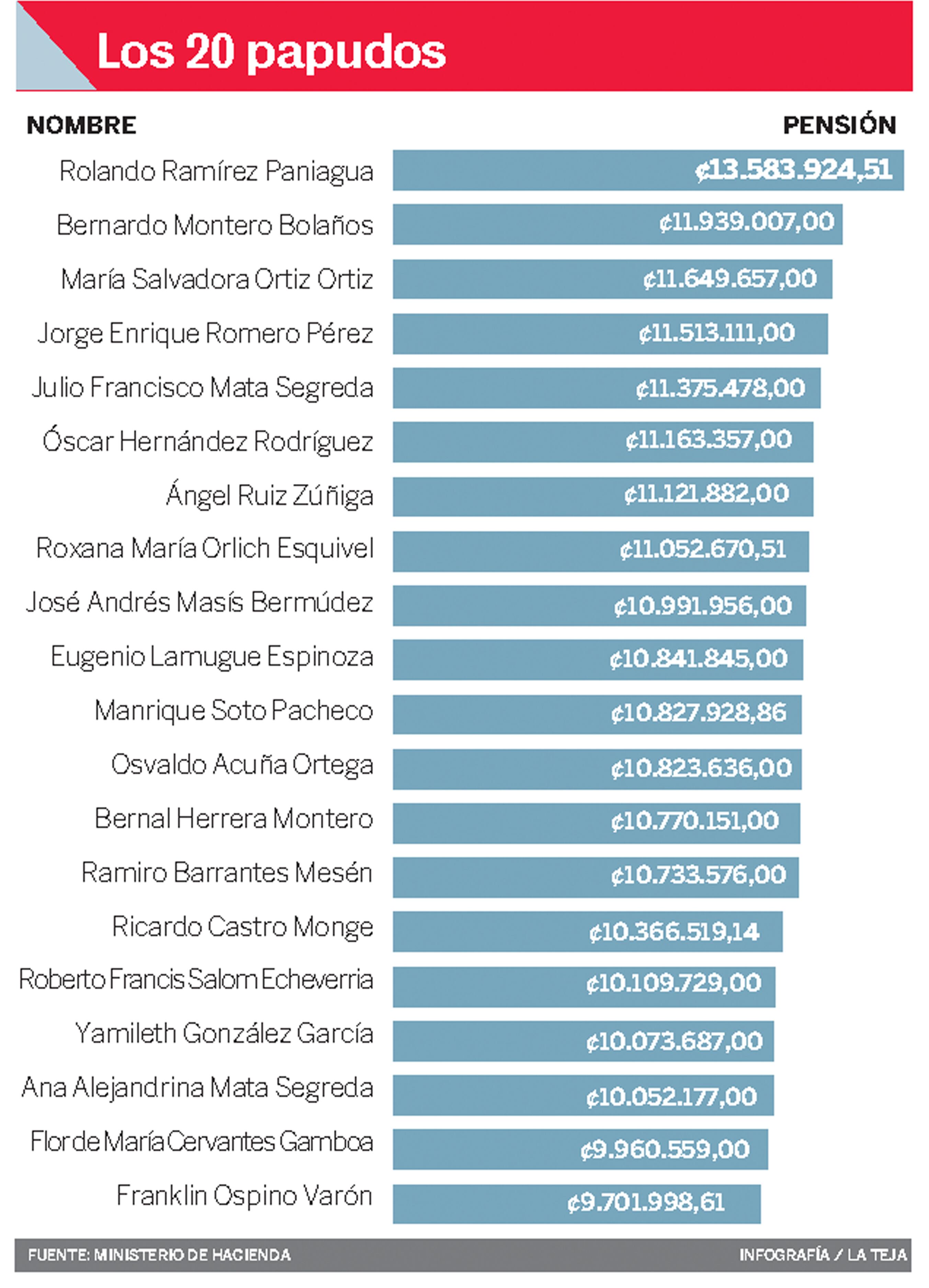 Según el Ministerio de Hacienda en el país hay 448 afortunados que reciben pensiones superiores a los ¢5 millones, la más alta pertenece a Rolando Ramírez Paniagua, a quien le depositan todos los meses la sabrosa suma de ¢13 melones y medio.
