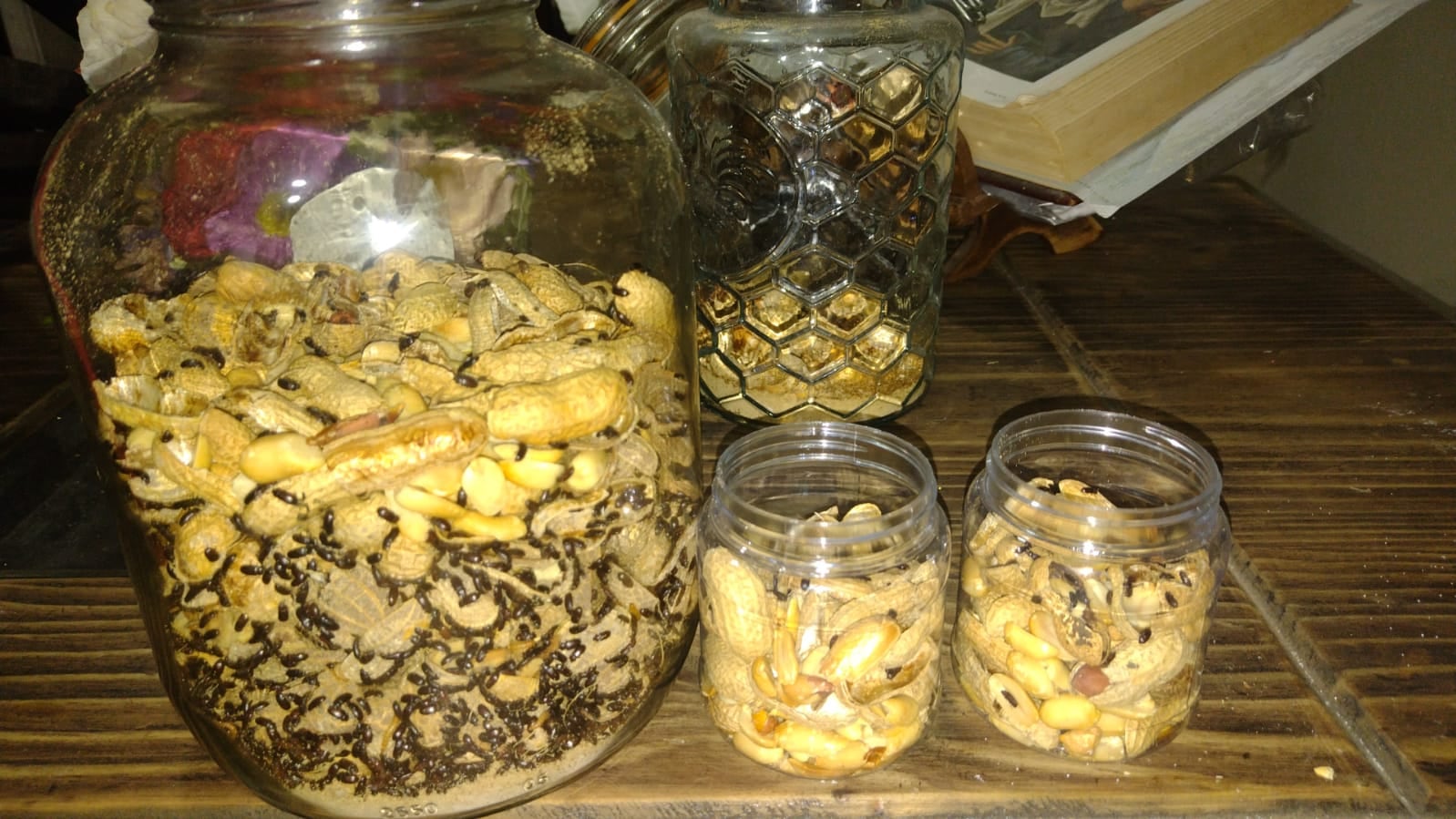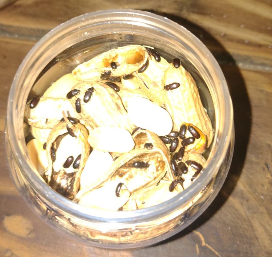 El mantener los bichitos es bastante fácil, hay que comprar maní con cáscara, sin sal, pelarlo y quitarle el pellejillo rojo, después se echan en un frasco de vidrio la cáscara dura y el maní.