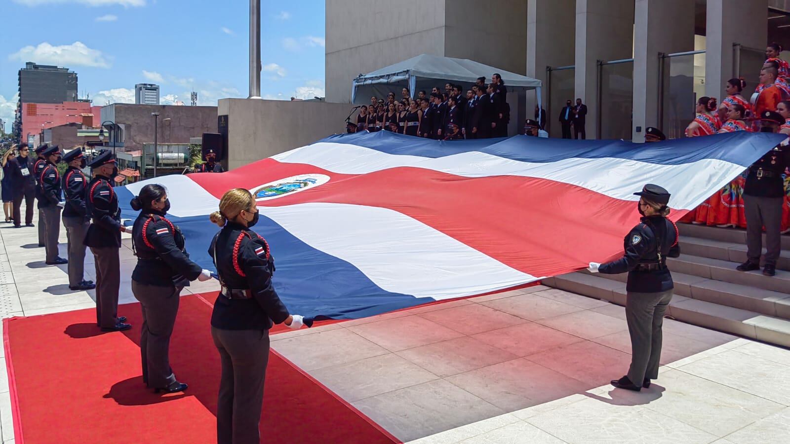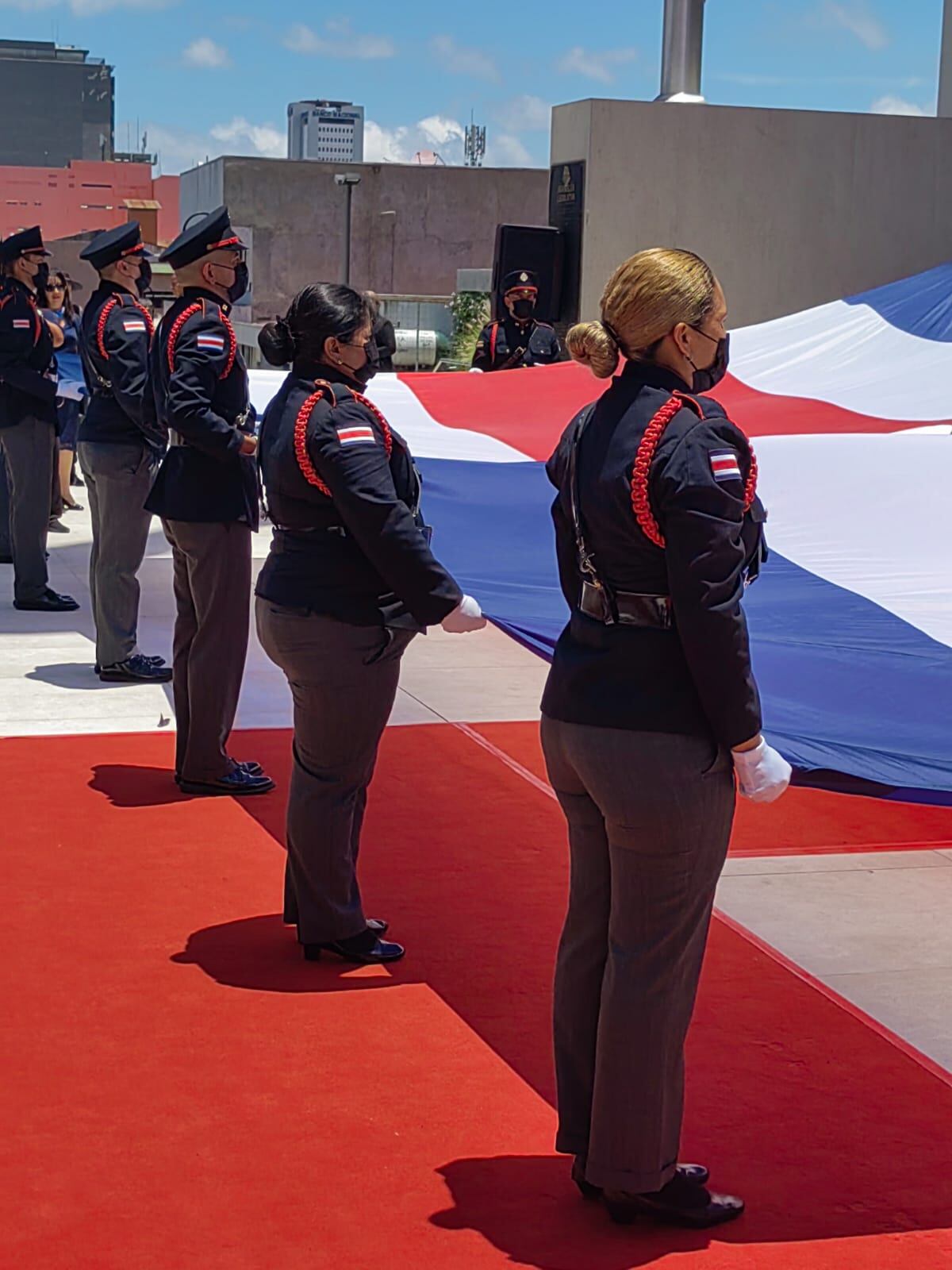 La Guardia de Honor de la Fuerza Pública engalanó el traspaso de poderes de Rodrigo Chaves Robles al extender un gran pabellón nacional frente al edificio de la Asamblea Legislativa, eso sí, debieron usar guantes en todo momento.